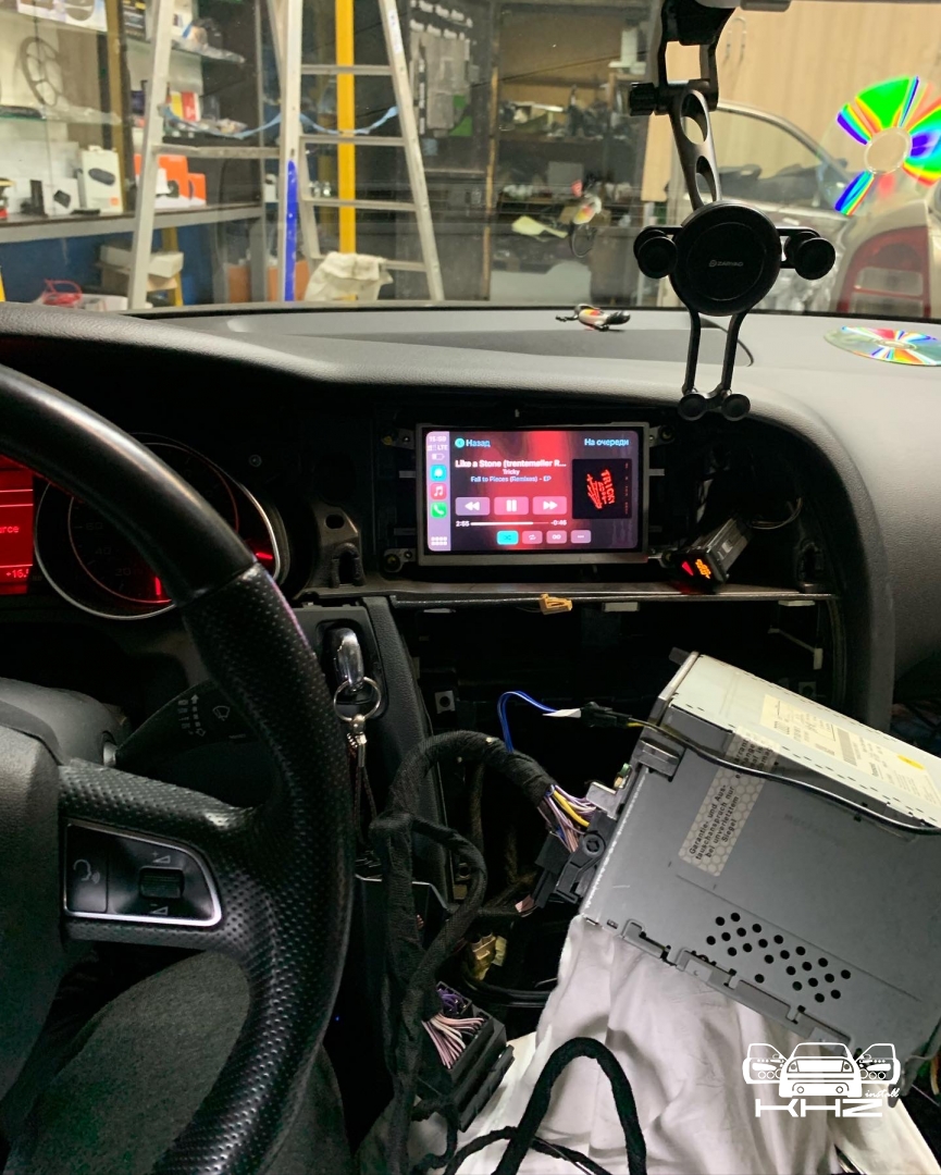 - Це встановити так званий CarPlay адаптер, що це? Розкажемо - це блок, який ми підключаємо до рідної магнітолі, і він дає нам ряд можливостей, на штатному екрані ви отримуєте мене свого телефону, ніби це Айфон або Андроїд, і це допоможе вам користуватися всіма функціями вашого телефону зі штатної магнітоли, не змінюючи нічого - так само даний блок дверей можливість підключити 2 камери заднього та переднього виду - для гарного паркування, даний варіант підходить для тих хто, не хоче міняти інтер'єр свого автомобіля - а просто розширити спектр функцій Audi A4 B8 або будь-якої іншої моделі Ауді або іншого бренду, все це ви можете замовити та встановити в нашому Центрі Кілогерц. Все меню телефону у вас на моніторі, таким чином ви отримуєте можливість дивитися відео - отримати хорошу навігацію, яка буде працювати з інтернетом і можливість підключення двох камер, виглядає це все ось так: