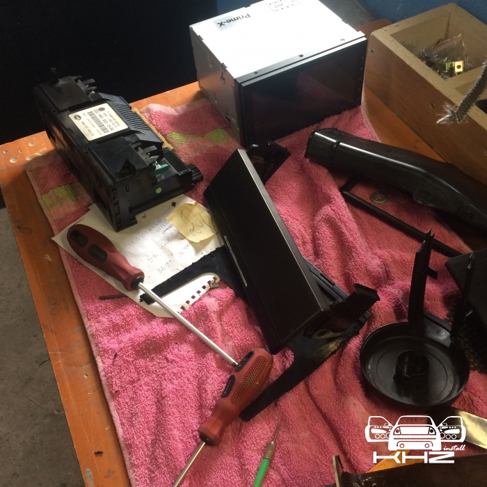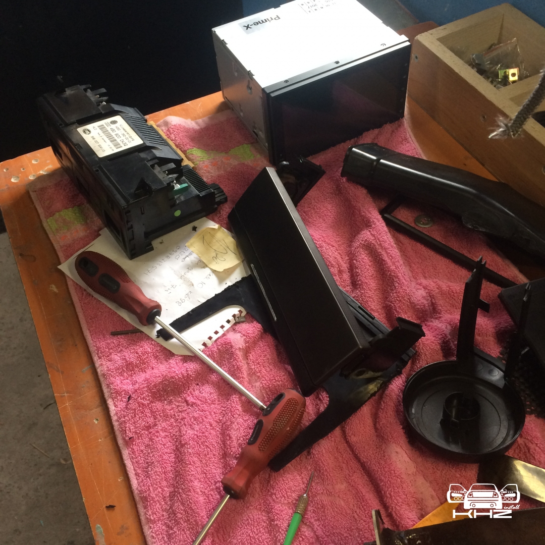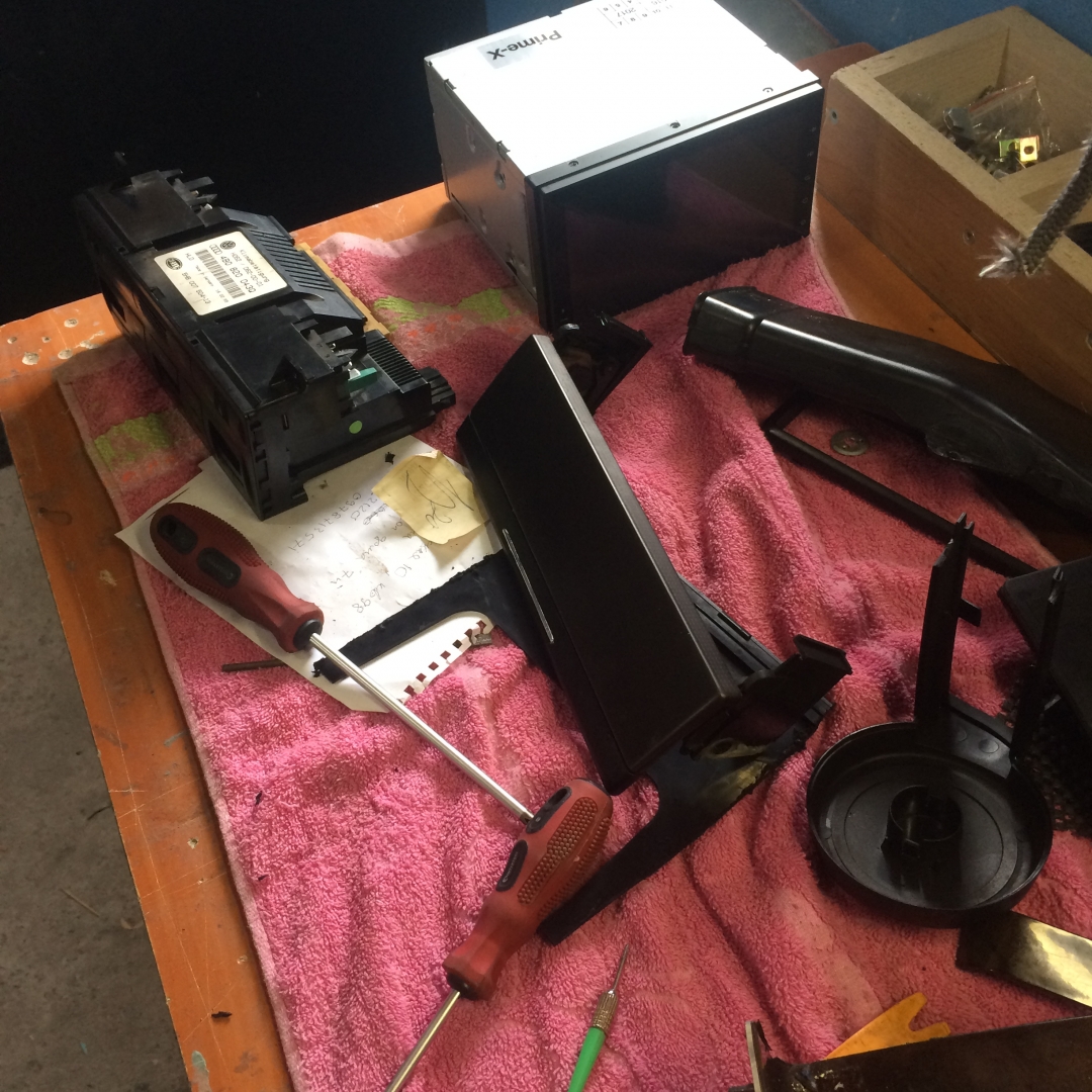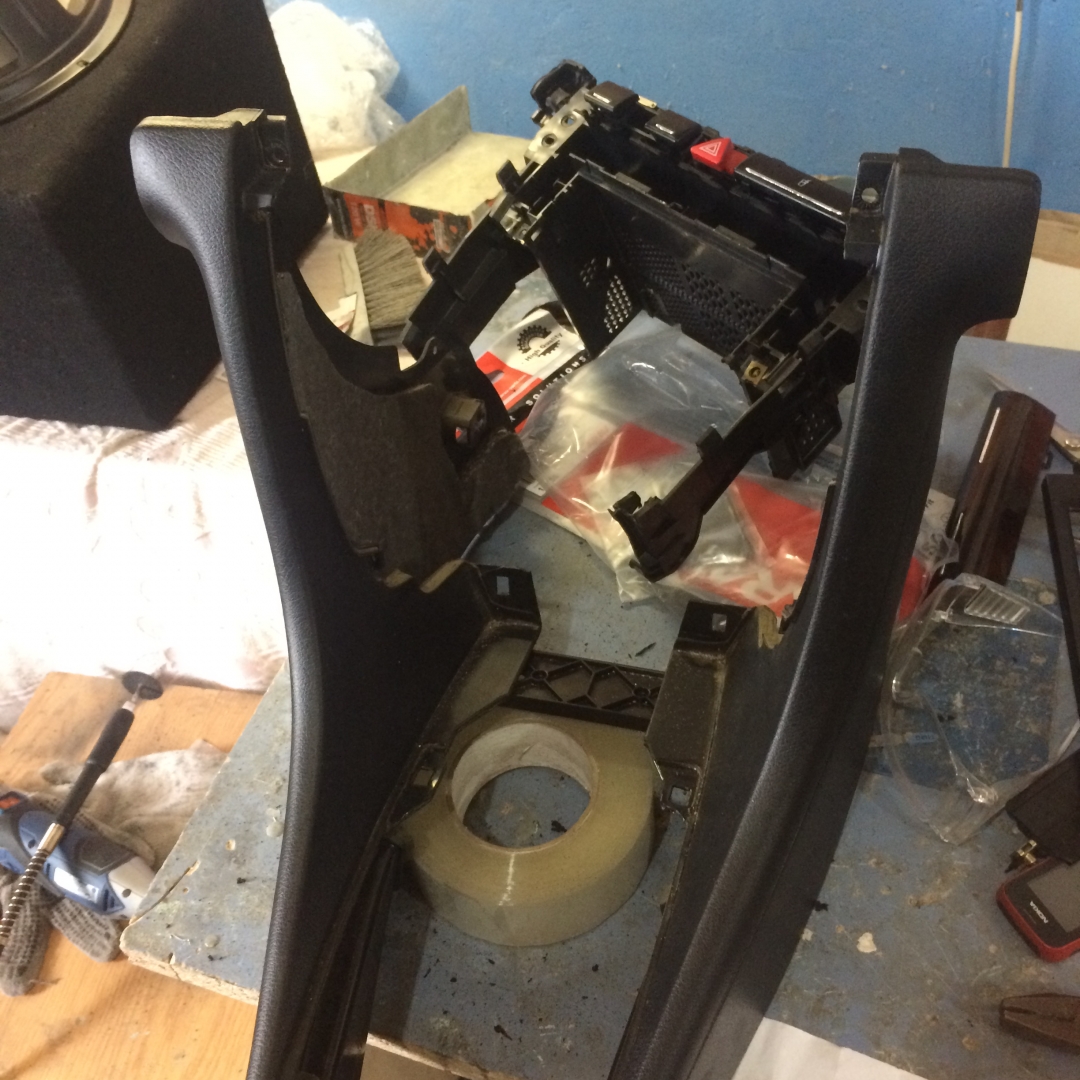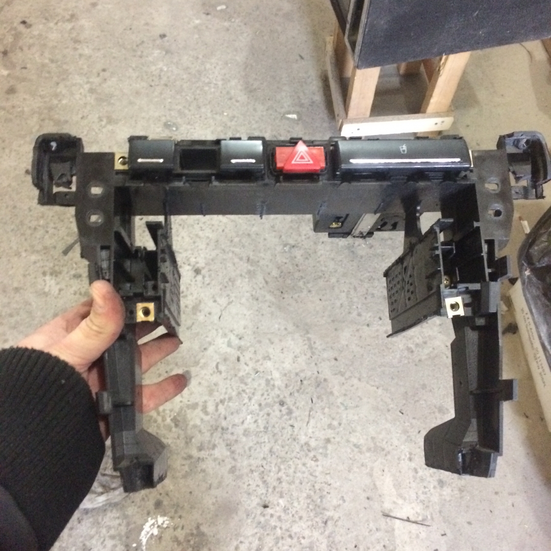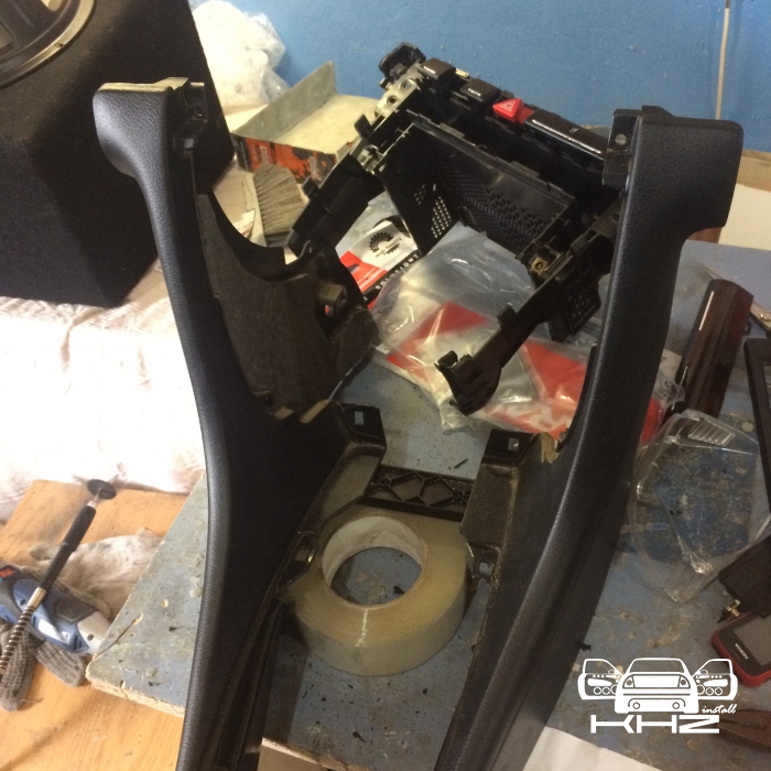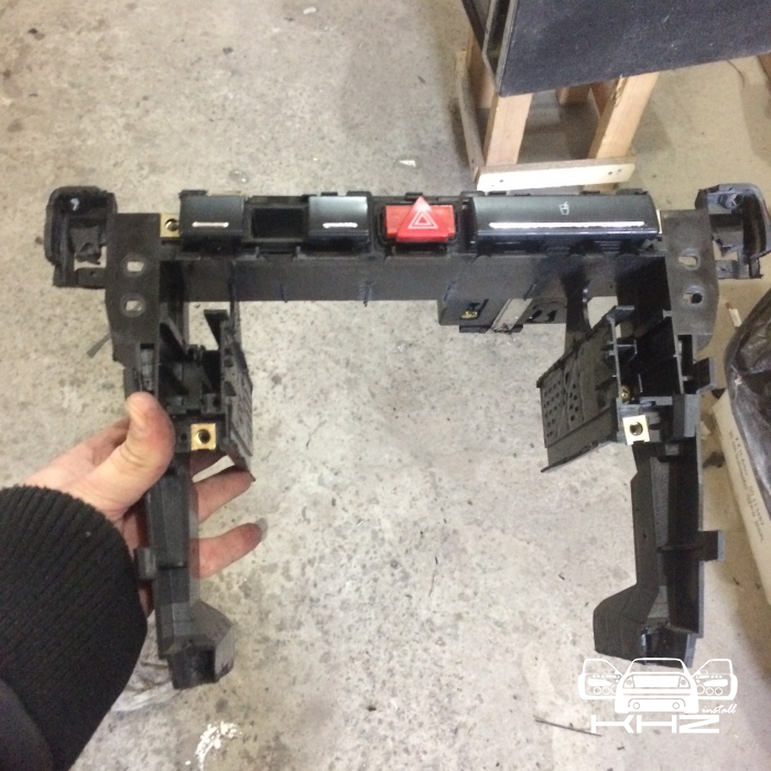 Далі ми почали працювати з основною консоллю, для цього нам знадобилася бор-машина і креативність. З консолі ми все демонтували, зняли основну рамку, в якій була магнітола і клімат, і розрізали пластик, який розділяв ці два блоки:
