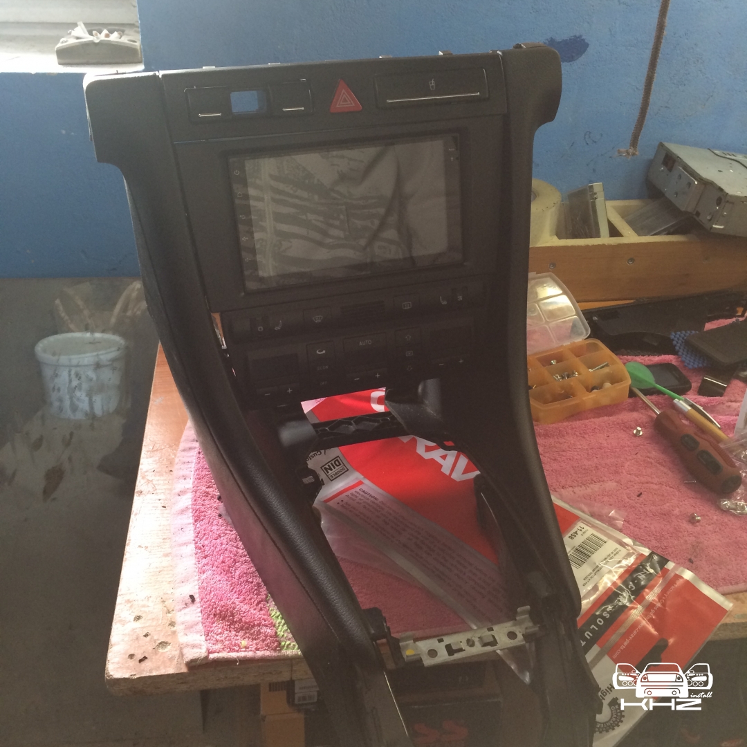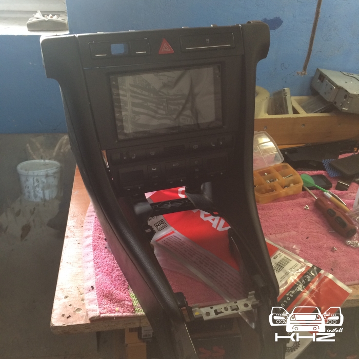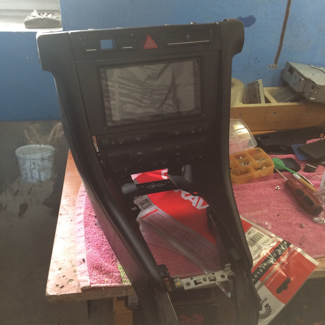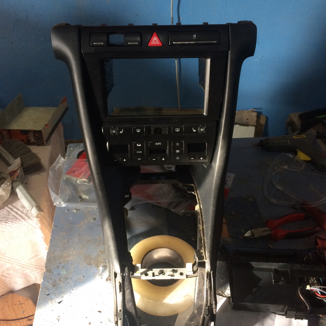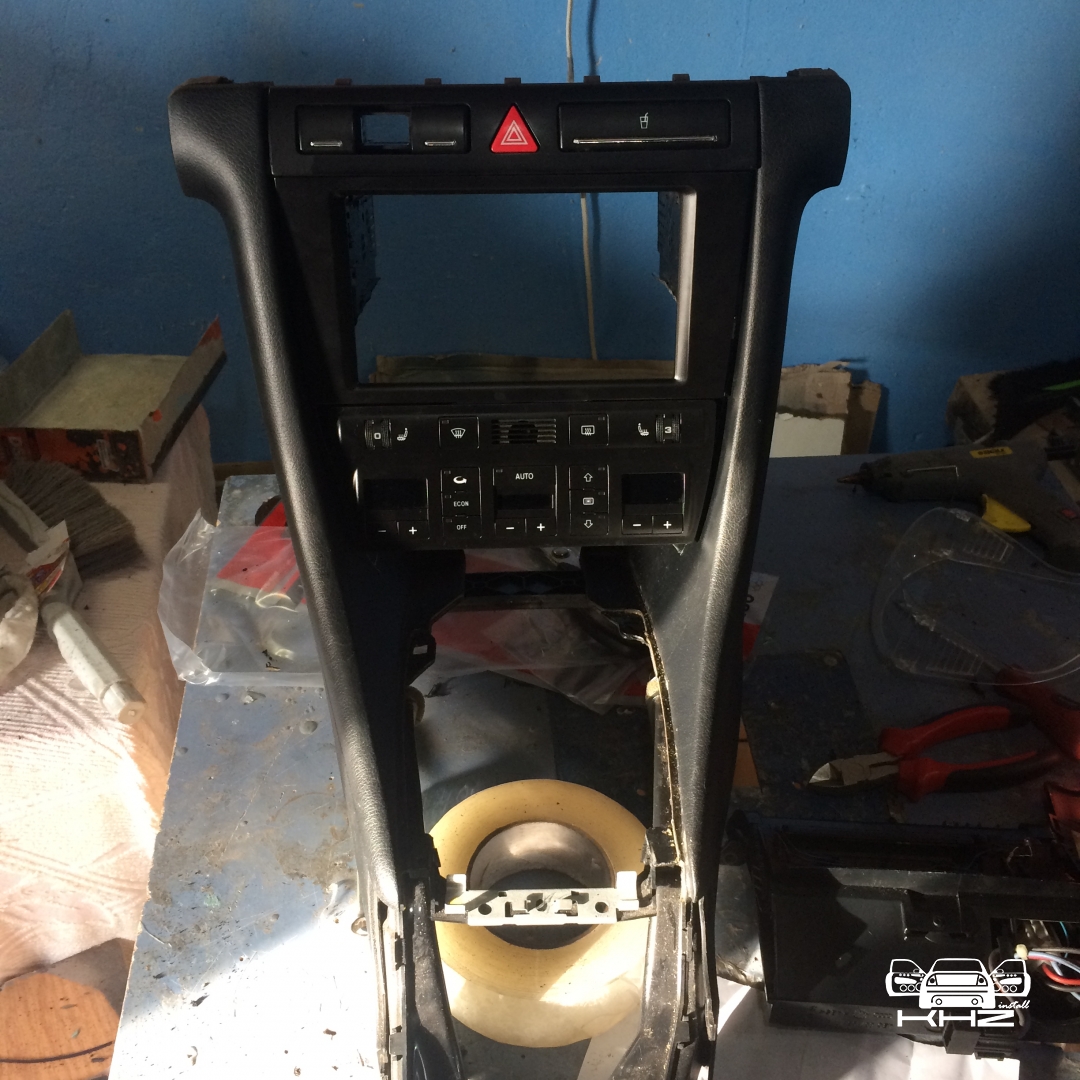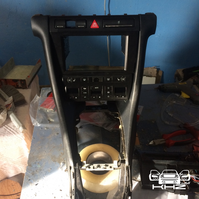 Тепер ми збираємо всю консоль назад і робимо спеціальну перегородку, щоб закрити простір під блоком клімату, ми зробили цю планку і перетягнули чорним шкірзамом. На фото нижче фінальна зібрана магнітола в ауді А6.