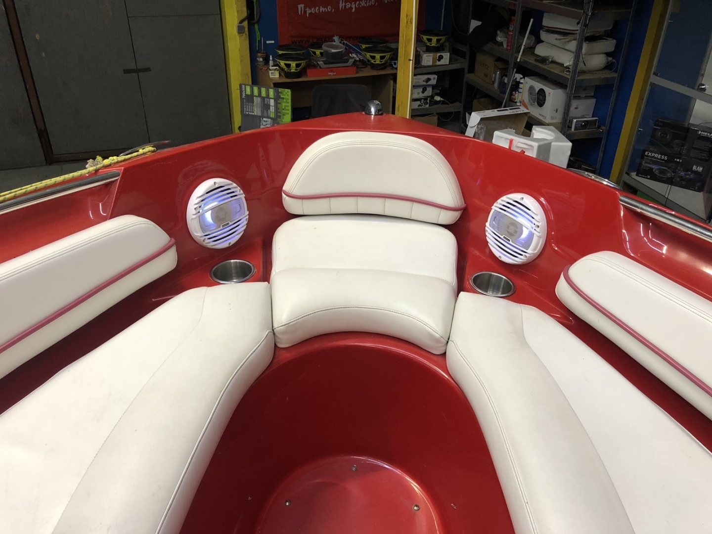 Так само у нас стояло завдання розібратися, чому гудуть сабвуфери Four Winns, вони встановлені під задніми сидіннями, в рундуках, але суть у тому, що рундуки ніяк не оформлені і сифонять з усіх боків, це перше, що треба виправити, навіть якщо морські сабвуфери вказано, що фріЕїр, то в будь-якому разі вони краще відпрацюють все-таки, коли оформлений об'єм для них. Тому ми починаємо це виправляти, наше завдання зашити ці короби і перетворити їх на окремі ящики, працюємо з фанерою і герметиком, потім наприкінці ми зашили верхні частини в білий шкірзам, щоб все було естетично. Так само провели ревізію сабвуферів - виявилося, що вони в нормі, ми їх змастили і почистили, далі проклали нову проводку і встановили в ті самі місця, але вже кожен у свій об'єм.