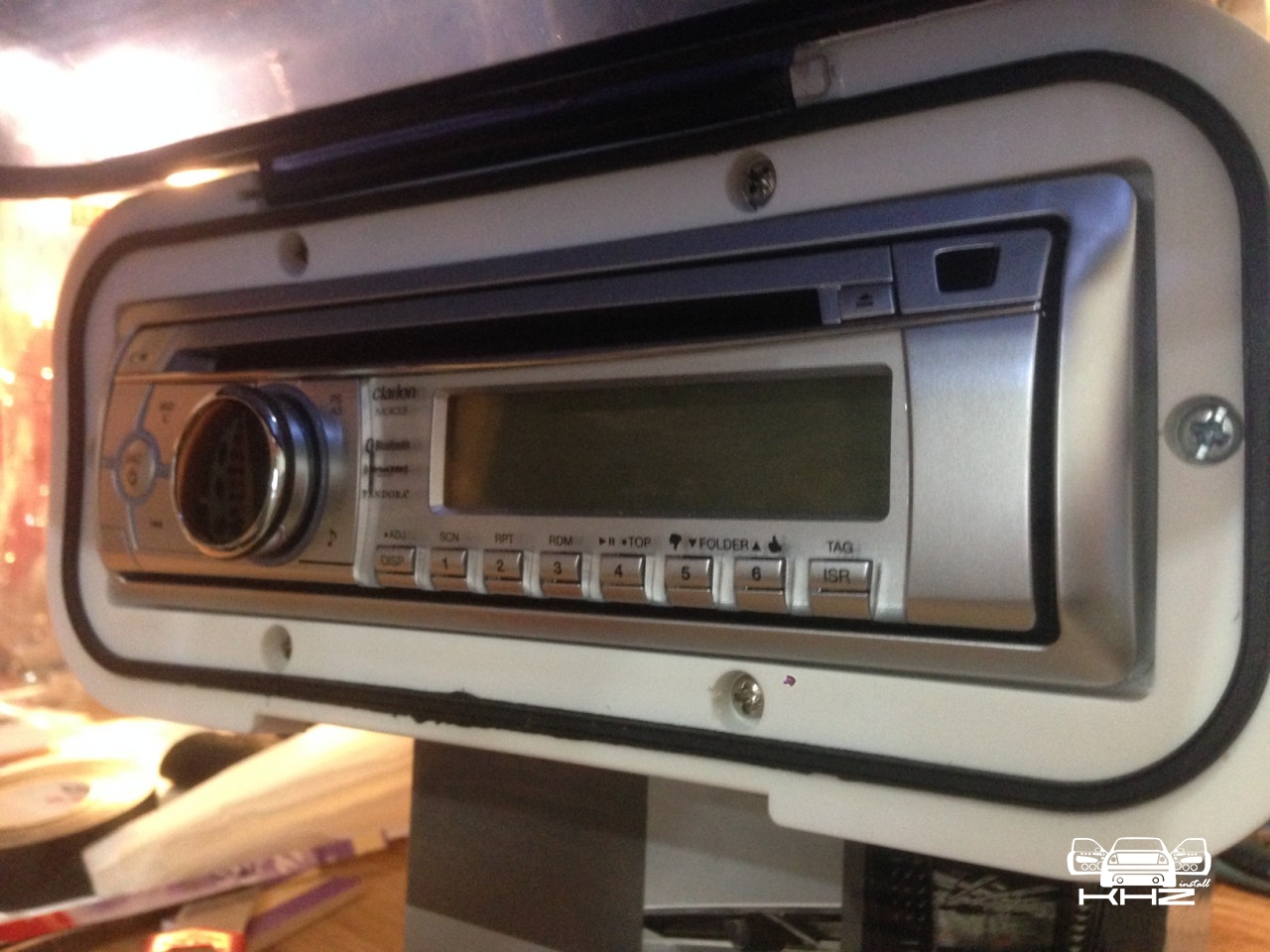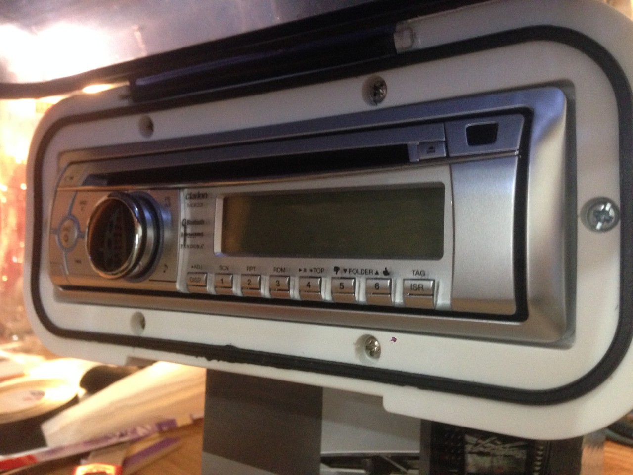 З цим ми закінчили і перейшли до встановлення головного пристрою, а саме - морської магнітоли Clarion M303, дуже багатофункціонального апарату з хорошим звучанням і найголовніше - з функцією блютуз, під нього замовник підібрав корпус вологозахисний, ми його туди упакували і вивели всі роз'єми.