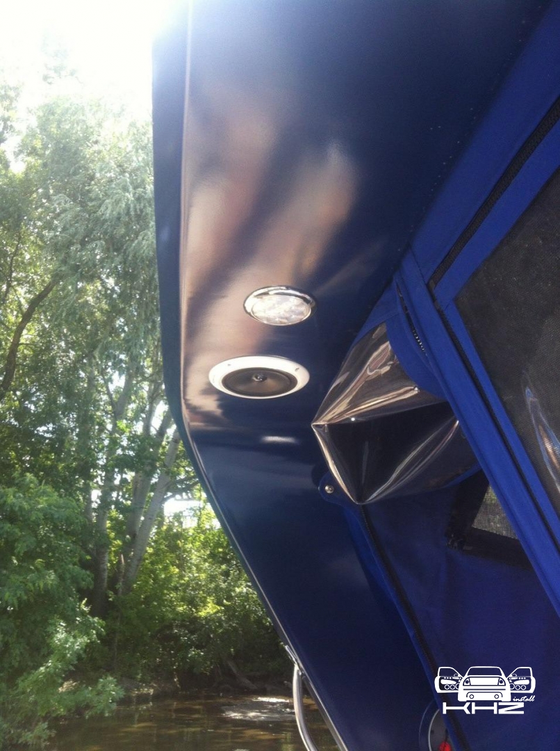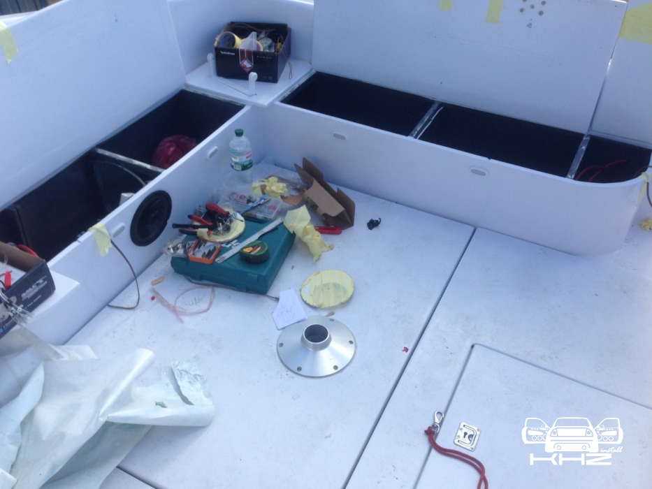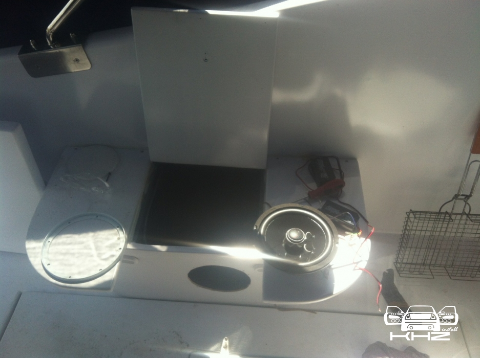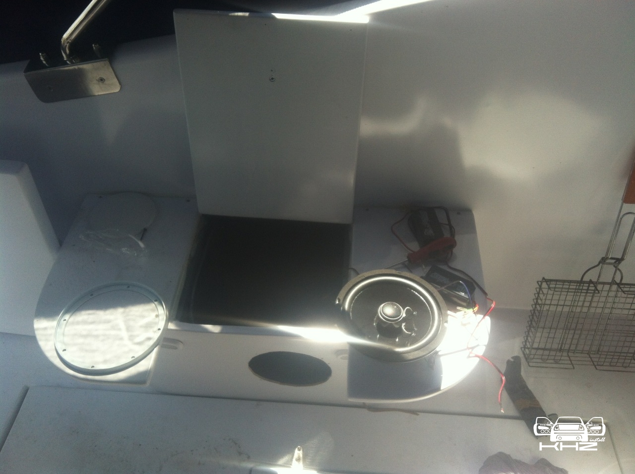 Завдання стояло таке: -заміна акустики, яка стояла, на потужнішу; -заміна головного пристрою на новий і з функцією Bluetooth; -встановлення сабвуфера та виготовлення корпусу на замовлення під нього; -протягування всієї нової проводки і встановлення підсилювача; -встановлення невеликих морських динаміків у спойлер катера. І так почнемо розповідь з того, як ми вирішили замінити акустику фірми JBL коаксильну на потужнішу від DLS і набагато більшу за об'ємом, а саме 20 см (8 дюймів), чому випав такий вибір, а тому, що морської акустики гарного класу в Україні не багато, а отже, що на катери ми в більшій частині підбираємо автомобільну акустику з відповідними матеріалами. Ось і приступили до прорізання отворів під більші динаміки.