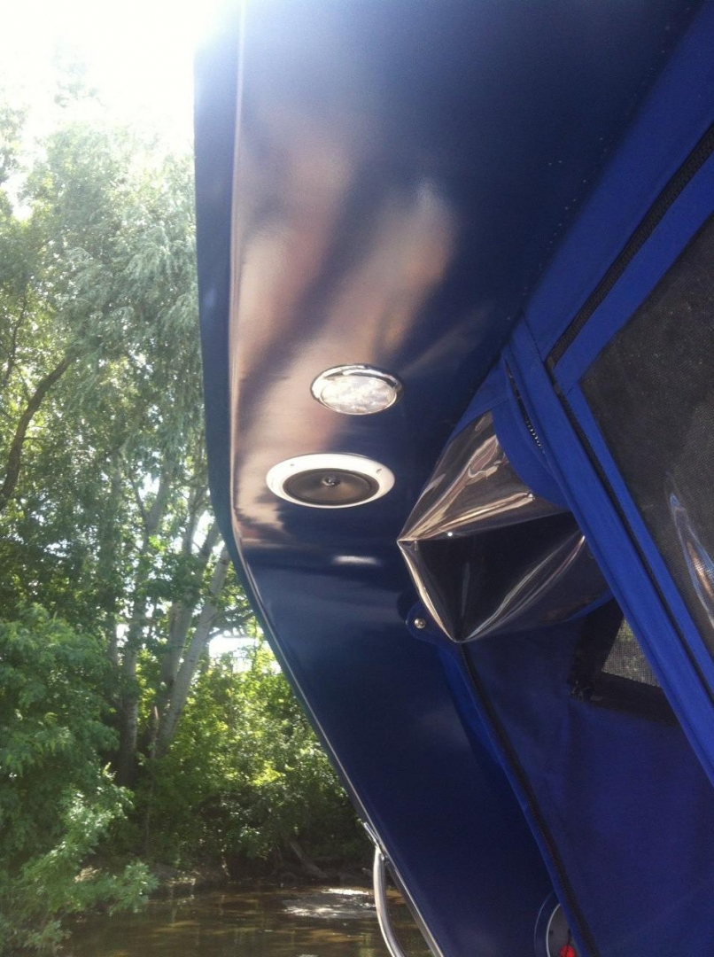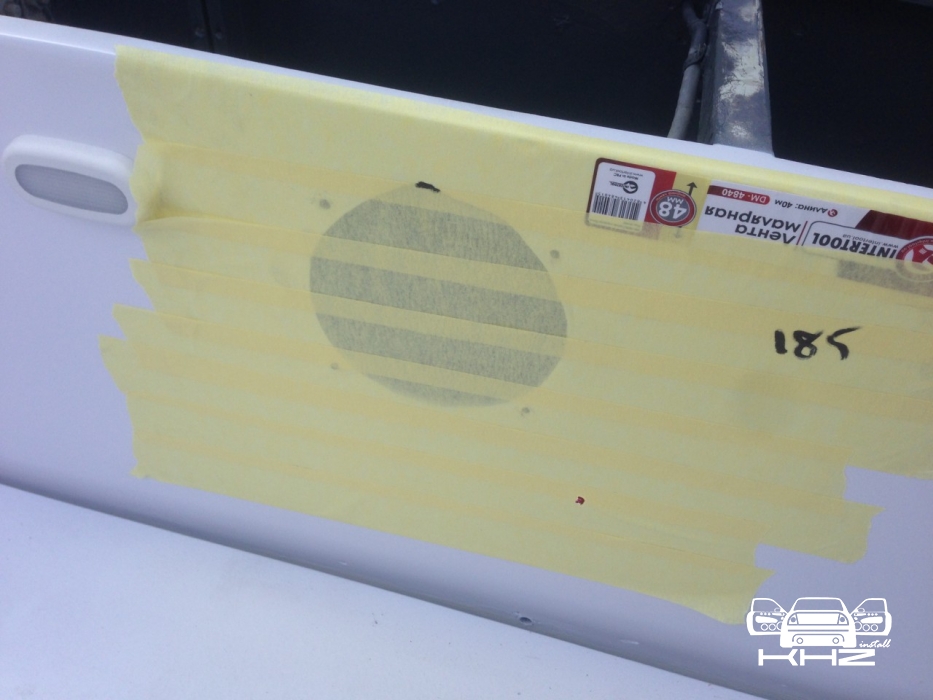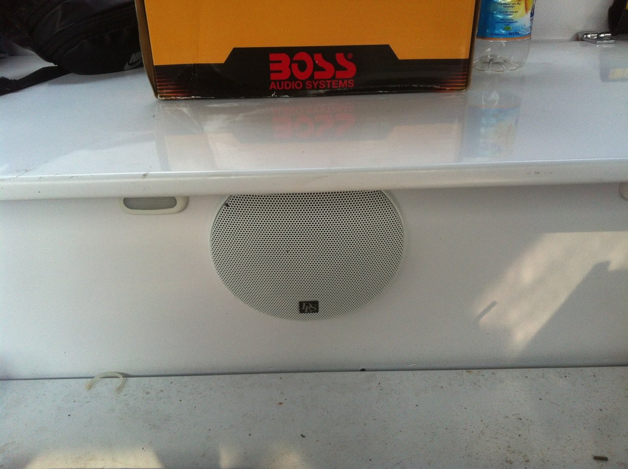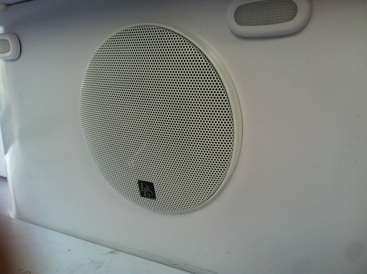Завдання стояло таке: -заміна акустики, яка стояла, на потужнішу; -заміна головного пристрою на новий і з функцією Bluetooth; -встановлення сабвуфера та виготовлення корпусу на замовлення під нього; -протягування всієї нової проводки і встановлення підсилювача; -встановлення невеликих морських динаміків у спойлер катера. І так почнемо розповідь з того, як ми вирішили замінити акустику фірми JBL коаксильну на потужнішу від DLS і набагато більшу за об'ємом, а саме 20 см (8 дюймів), чому випав такий вибір, а тому, що морської акустики гарного класу в Україні не багато, а отже, що на катери ми в більшій частині підбираємо автомобільну акустику з відповідними матеріалами. Ось і приступили до прорізання отворів під більші динаміки.