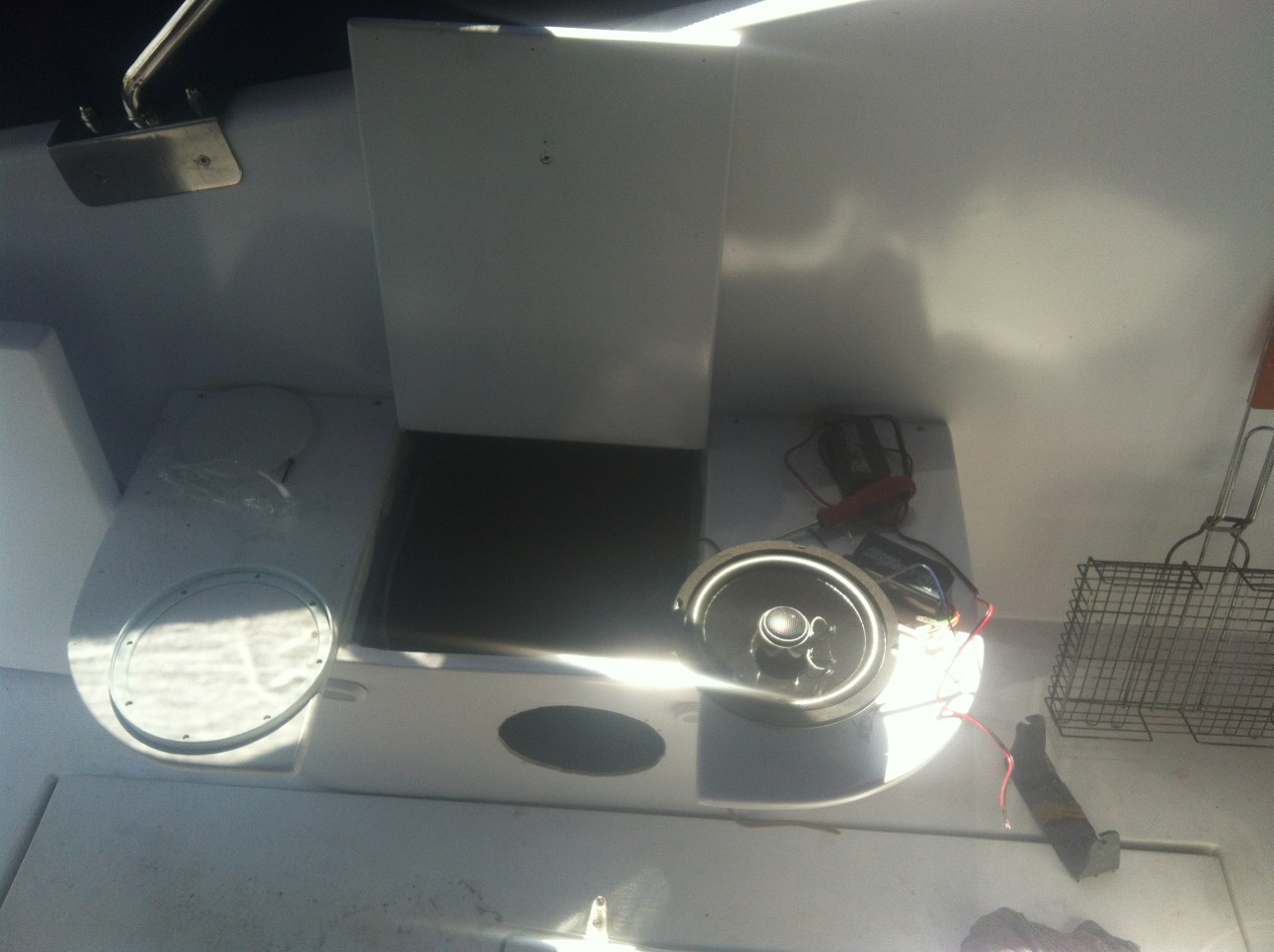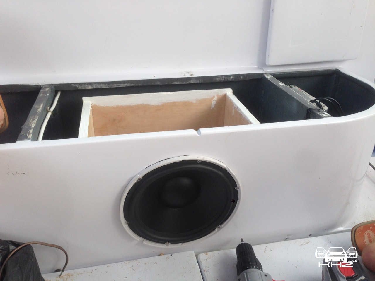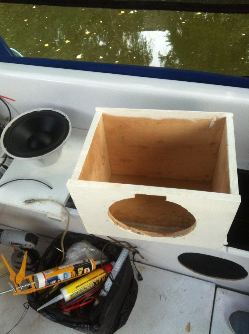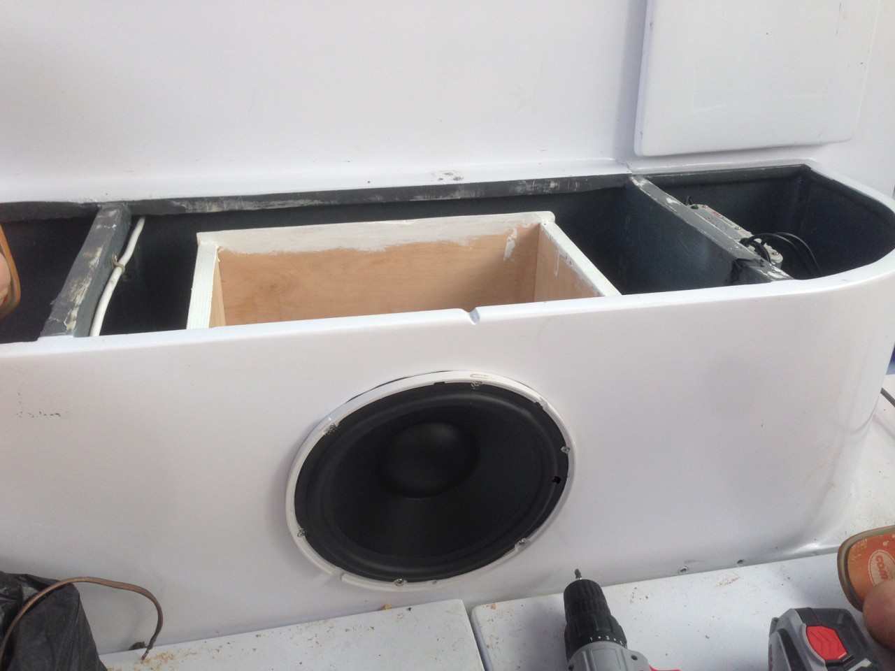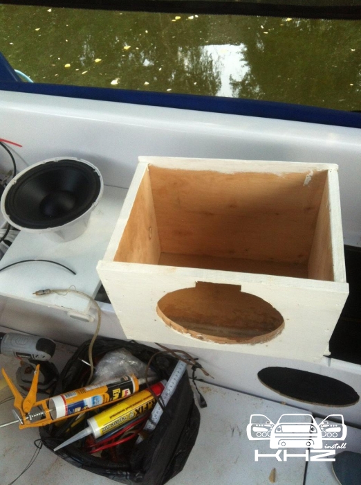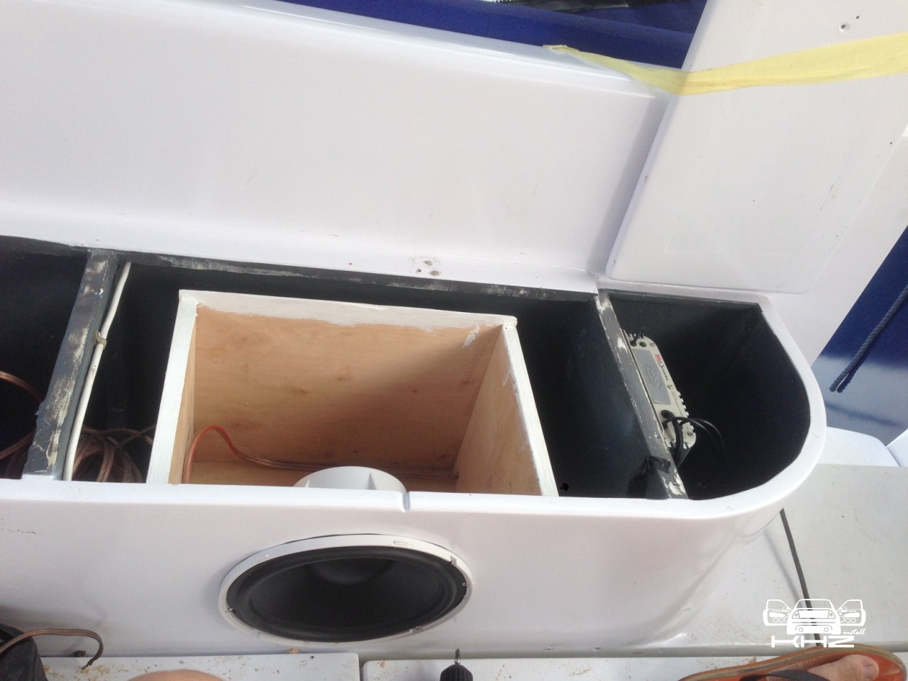 Тепер перейдемо до сабвуфера і короба на замовлення. Короб ми виготовили з вологостійкої фанери 18мм, просочили спеціальним просоченням, пофарбували та покрили лаком, короб ми доробляли вже на катері, бо треба було по його отвору прорізати й дірку під сидінням катера, загалом на фото все буде зрозуміліше:
