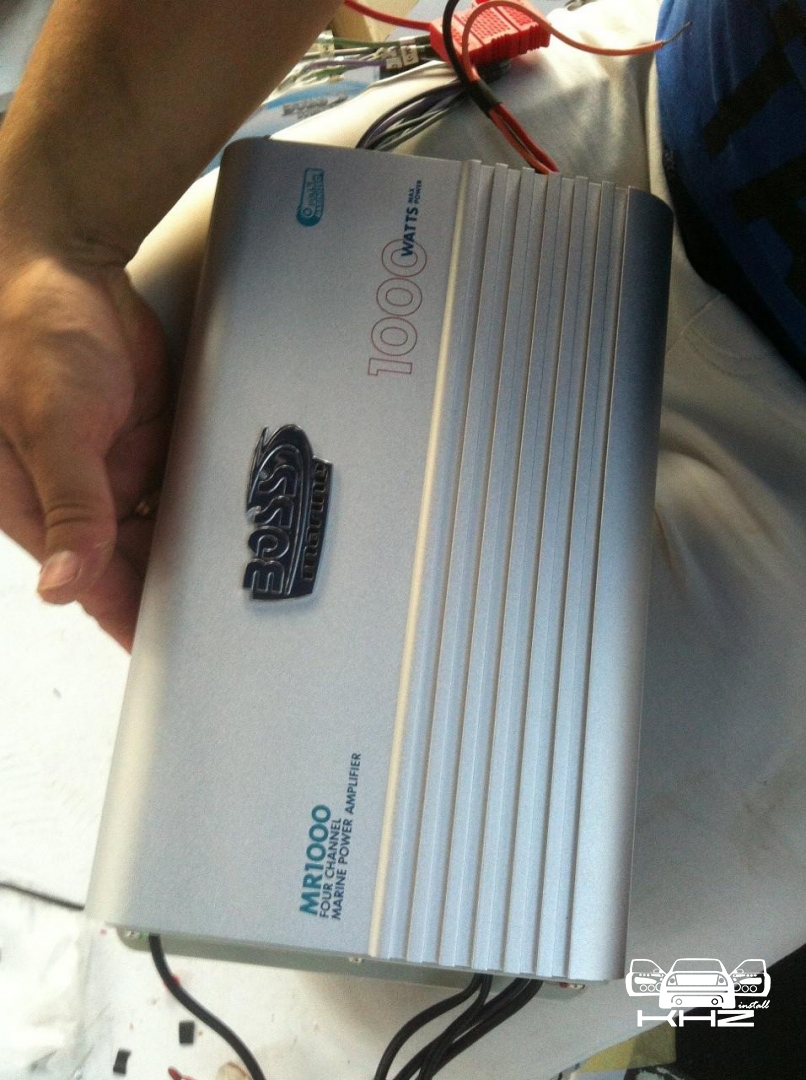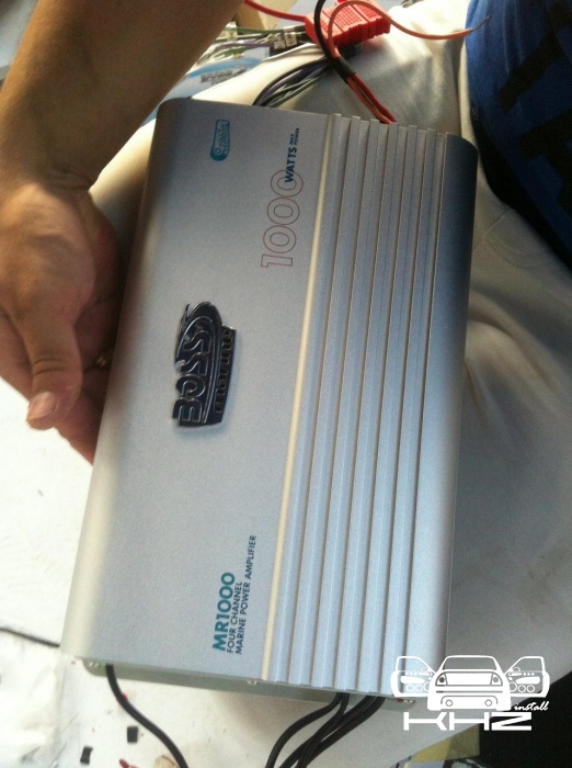 Зверху короб був закритий кришкою на герметику. Далі перейдемо до підсилювача звуку, який поставили на катер, він був так само морської серії і теж фірми BOSS серії MARINE MR1000. І був встановлений в окремій ніші по сусідству з сабвуфером, додатково ми його промазали силіконом в самих не захищених місцях.