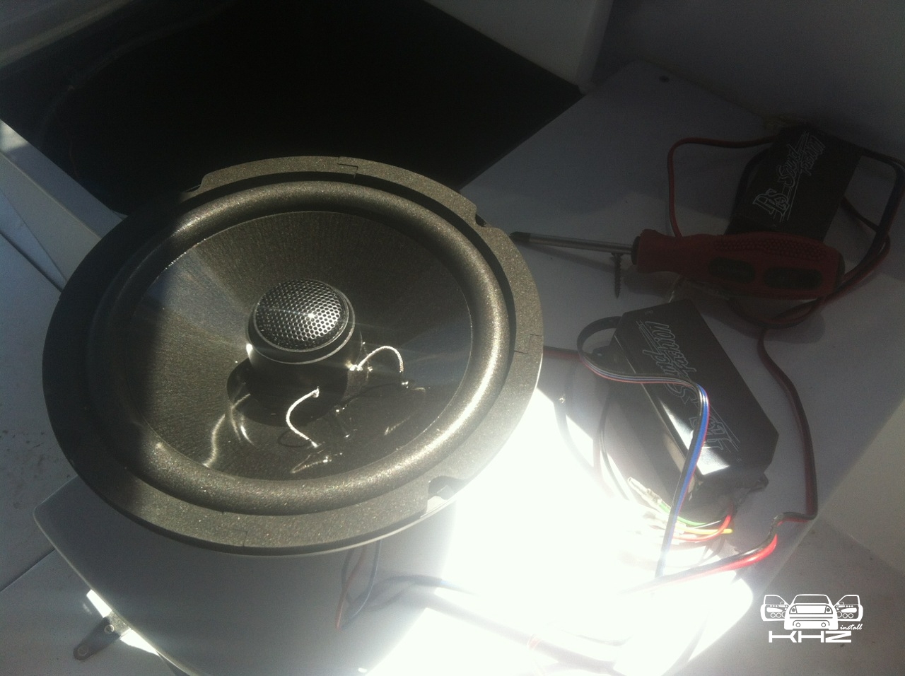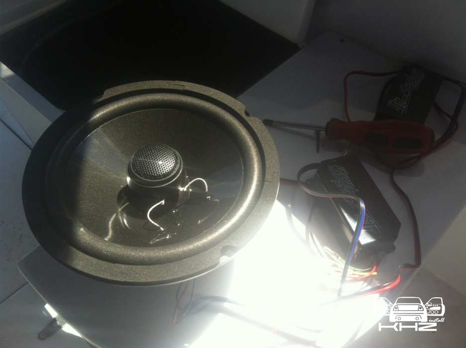 На фото зверху показана ніша, в яку був закріплений підсилювач. Далі розповім про акустику, яку ми встановили в так званий спойлер, в ньому було прорізано два невеликих отвори, але їх потрібно було ще прорізати більше, але динаміки вибрали ультра плоскі, оскільки місця в спойлері взагалі не було. Динаміки були закріплені на шурупи з нержавійки і силікон.