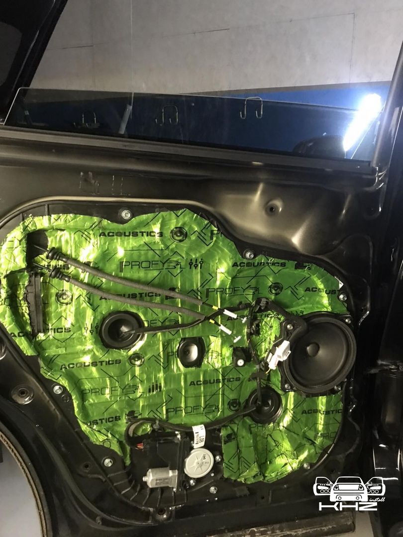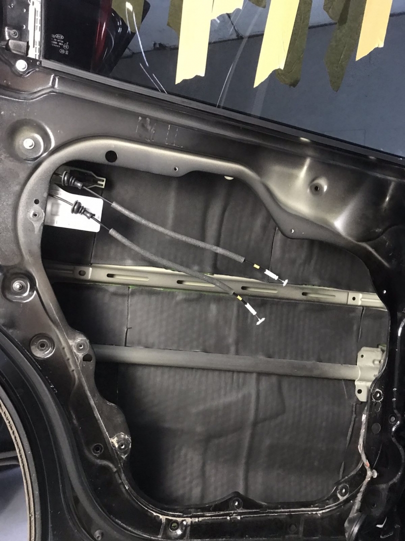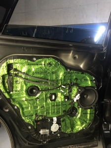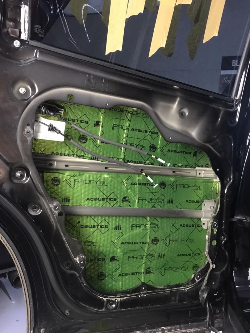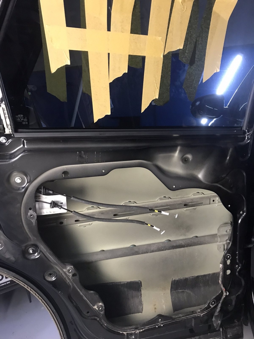 В даному випадку замовник вибрав шумоізоляцію дверей KIA Sorento і шумоізоляцію арок KIA Sorento. Почнемо з дверей, щоб зробити добре двері і максимально правильно - потрібно їх розібрати максимально, тоді можна виклеїти максимальну площу поверхні. Отже, двері розібрано і знімаємо пластиковий щит, а також фіксуємо скло до верхньої частини дверей. І приступаємо до підготовки поверхонь - вимиваємо, і знежирюємо антисиліконом, витираємо поверхню і наносимо перший шар віброізоляції. Віброізоляція для даної шумоізоляції обрана бренду Acoustics - це Український виробник, який робить матеріали, які за якістю як зарубіжні - але за ціною не космос. Перший шар ми викладаємо матеріал в нахлест один на одного. Таким чином ми робимо додаткові ребра жорсткості для кволого металу, це додасть менших коливань двері на високій швидкості, а це призведе до зниження шуму.