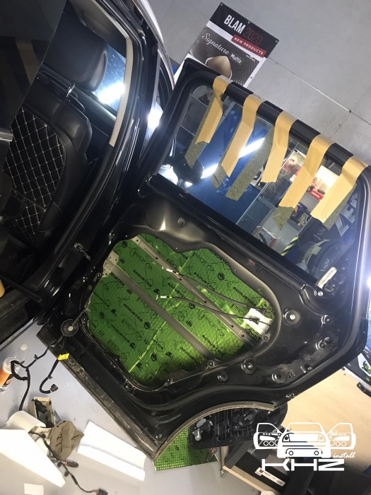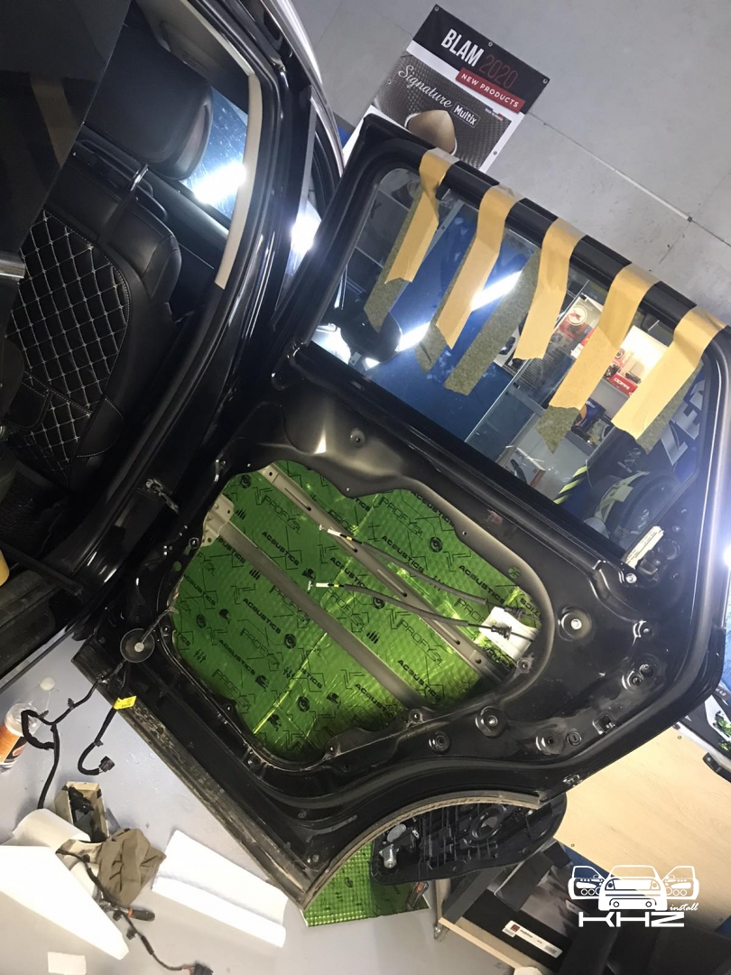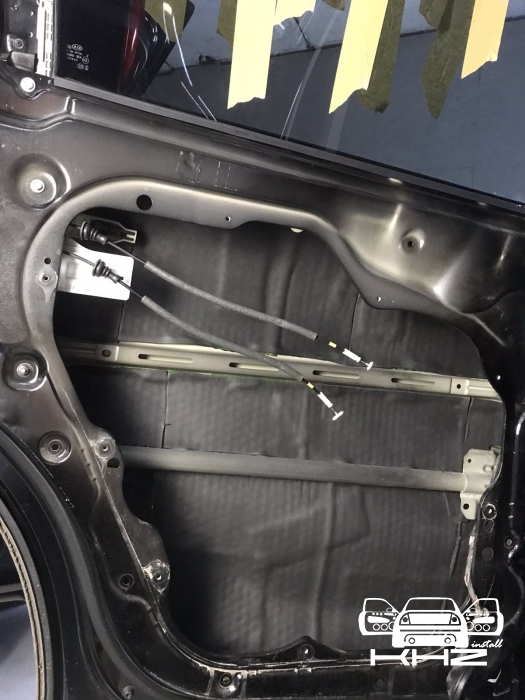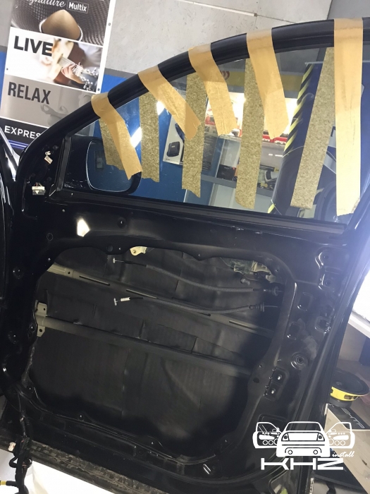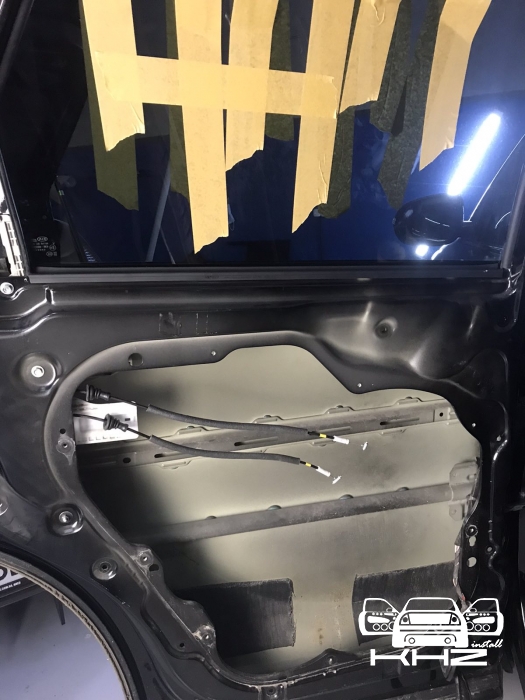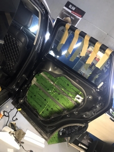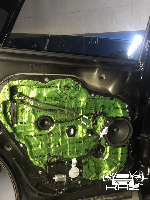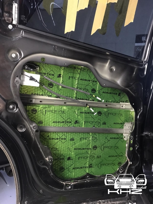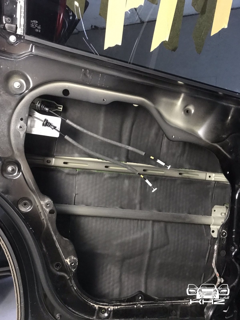 В даному випадку замовник вибрав шумоізоляцію дверей KIA Sorento і шумоізоляцію арок KIA Sorento. Почнемо з дверей, щоб зробити добре двері і максимально правильно - потрібно їх розібрати максимально, тоді можна виклеїти максимальну площу поверхні. Отже, двері розібрано і знімаємо пластиковий щит, а також фіксуємо скло до верхньої частини дверей. І приступаємо до підготовки поверхонь - вимиваємо, і знежирюємо антисиліконом, витираємо поверхню і наносимо перший шар віброізоляції. Віброізоляція для даної шумоізоляції обрана бренду Acoustics - це Український виробник, який робить матеріали, які за якістю як зарубіжні - але за ціною не космос. Перший шар ми викладаємо матеріал в нахлест один на одного. Таким чином ми робимо додаткові ребра жорсткості для кволого металу, це додасть менших коливань двері на високій швидкості, а це призведе до зниження шуму.