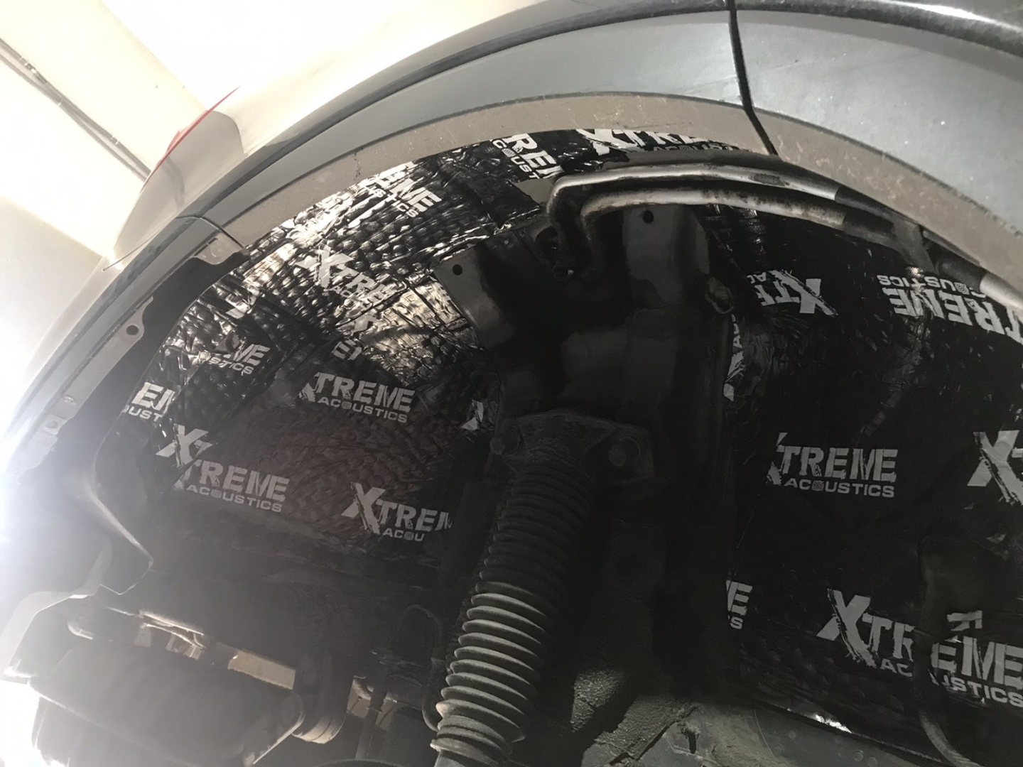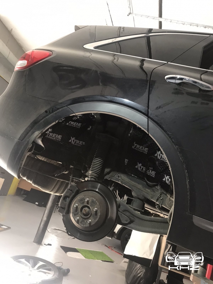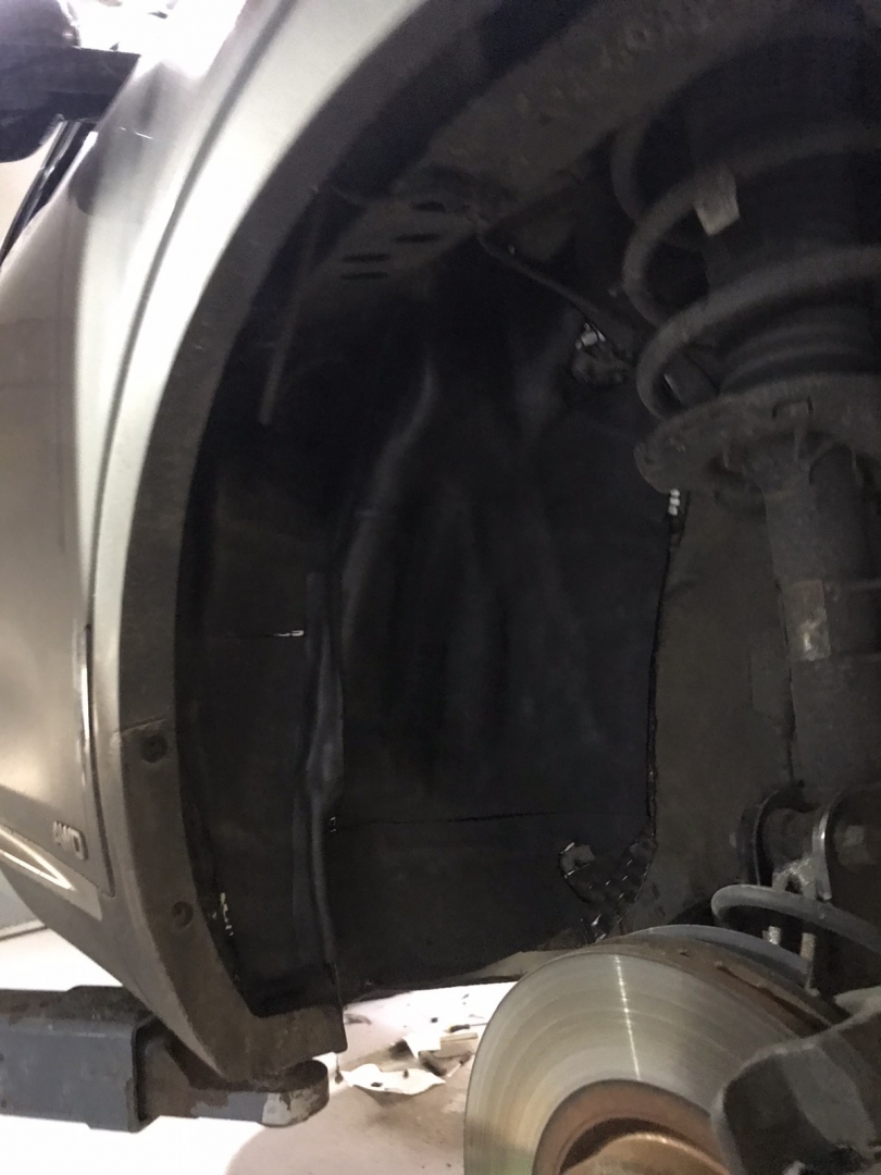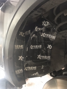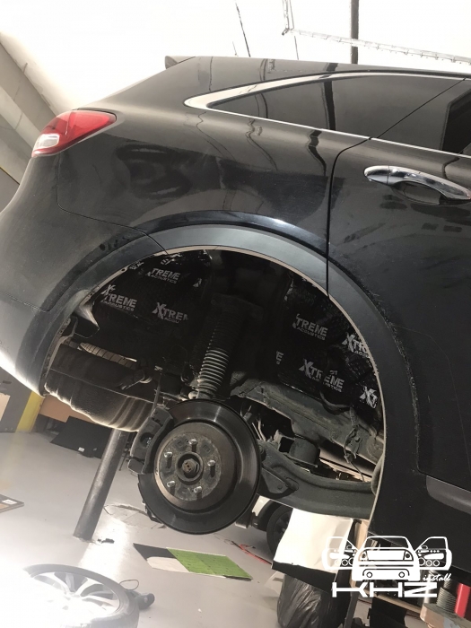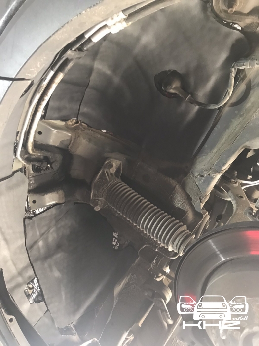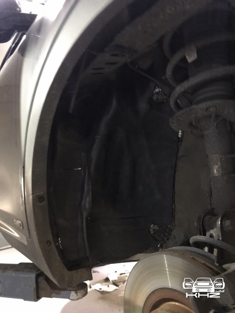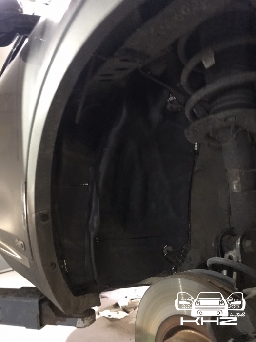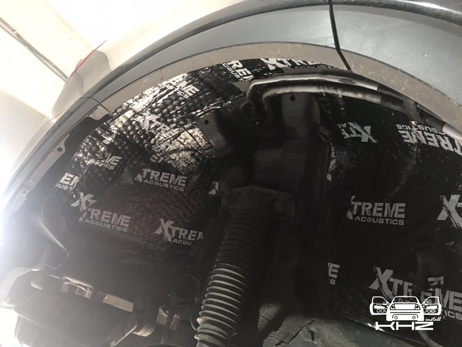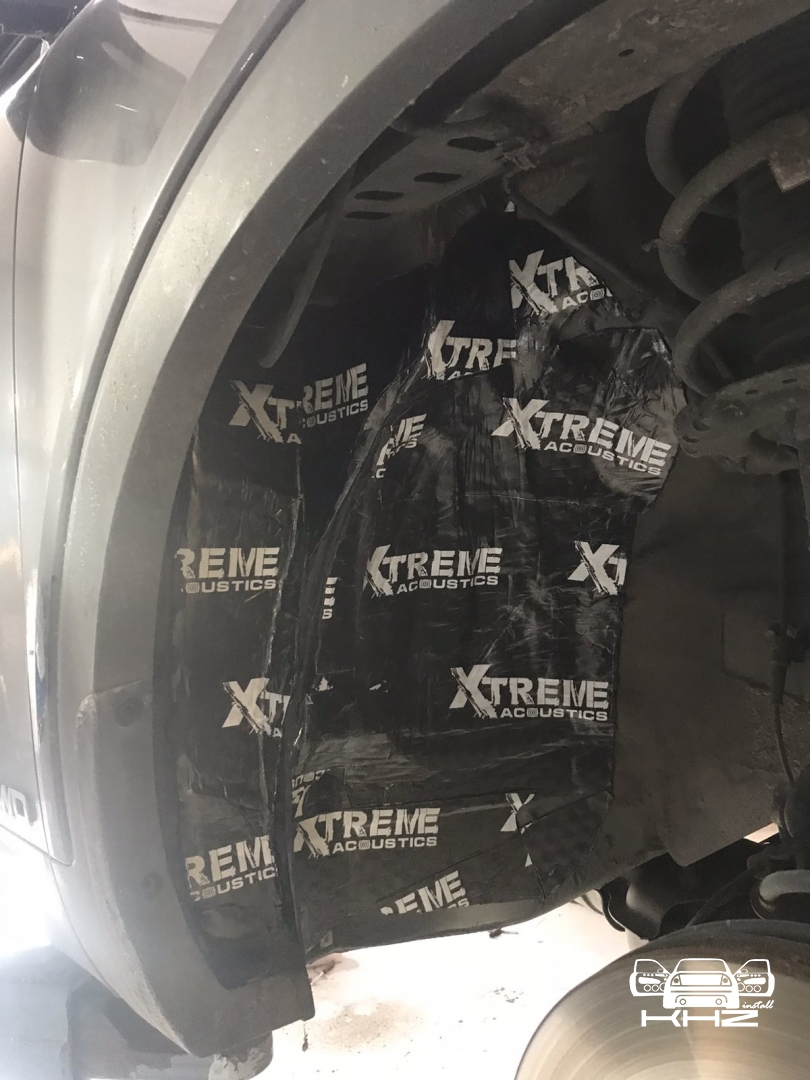 Щодо шумоізоляції дверей KIA Sorento закінчили і можемо переходити на другу зону, яка приносить дискомфорт в автомобілях КІА, це колісні арки, задні арки можна робити як з салону, так і ззовні, а ось передні, зсередини практично не видно, і добре їх зробити зсередини не вийде, тому робимо зовнішню частину і отримуємо максимальний результат. Тому і передні арки, і задні будемо обробляти ззовні. Для цього ми знімаємо підкрилки - спереду пластиковий, ззаду, як правило, ганчір'яний.І приступаємо до миття металу - чому це складна робота, оскільки це дуже брудна робота, при шумоізоляції арок KIA Sorento найголовніше - це правильно підготувати поверхню, вичистити від бруду, потім вимити кілька разів, оскільки зовні часто присутні ще жирні олії та всілякі мастила, які важко змити, і останній етап - це знежирення, щільне миття антисиліконом та витираємо насухо. Для шумоізоляції арок ми використовуємо матеріал Acoustics Xtreme, цей матеріал славиться своїм клейовим шаром, мастика настільки добре тримається - що зняти її фантастично складно. Матеріал укладаємо так само в нахлест з ребрами жорсткості, і максимально добре викочуємо за допомогою прикаточного валика. Матеріал беремо більш товстий для арок - ніж для дверей.