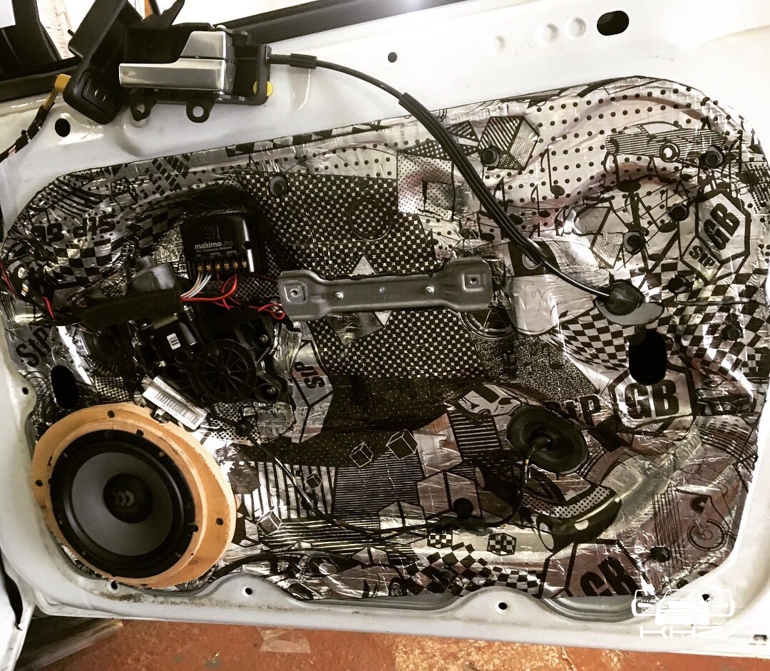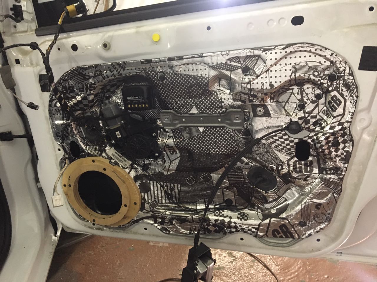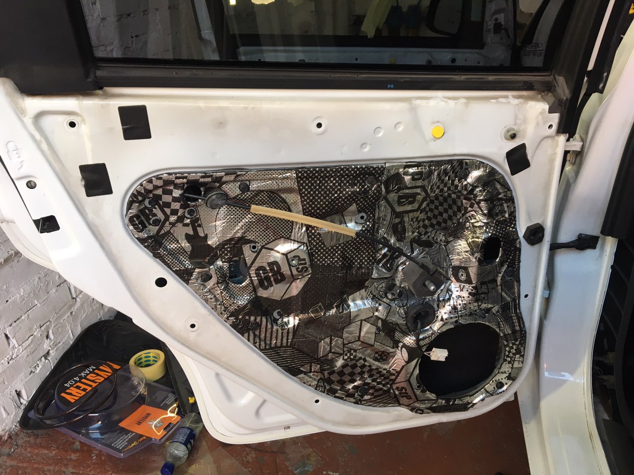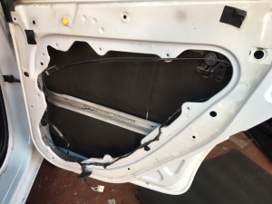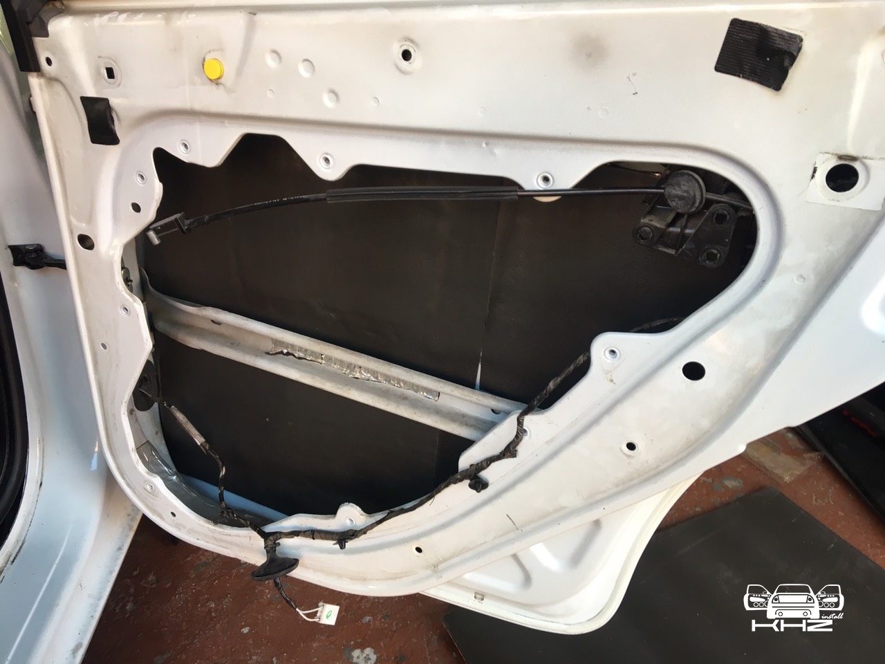 Для шумоізоляції дверцят ми знімаємо карти, потім фіксуємо скло і знімаємо щит, щоб дістати до внутрішньої частини дверцят, для якісного укладання матеріалів. Миємо і знежирюємо метал, і укочуємо віброізоляцію.
