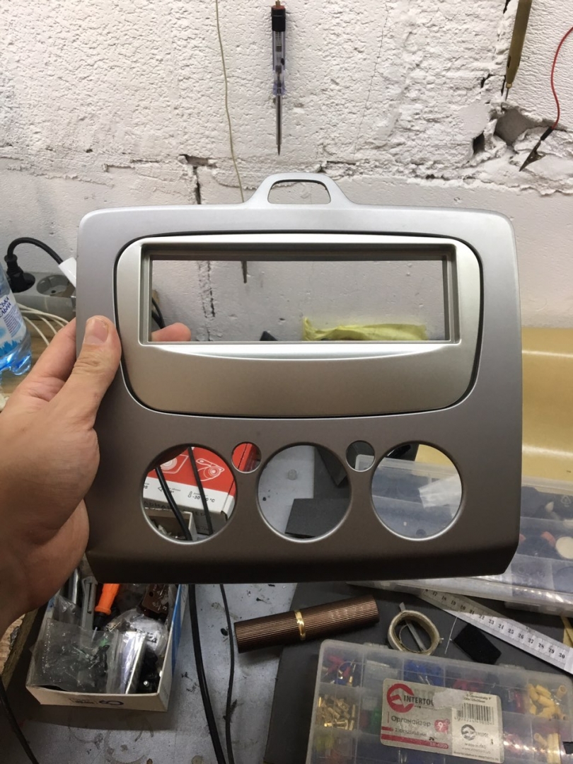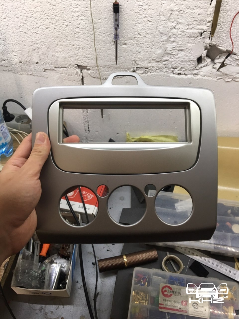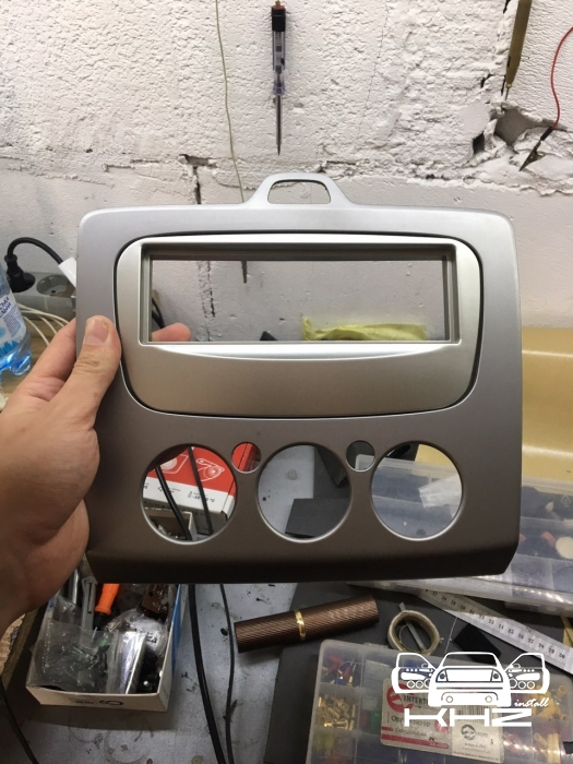 Як бачите дуже акуратно він там розмістився, і не заважає на спинці сидіння, підсилювач звуку ми налаштували і приступили до заміни головного пристрою Ford Focus, демонтуємо його, і для установки нового нам буде потрібна перехідна рамка.