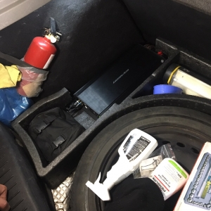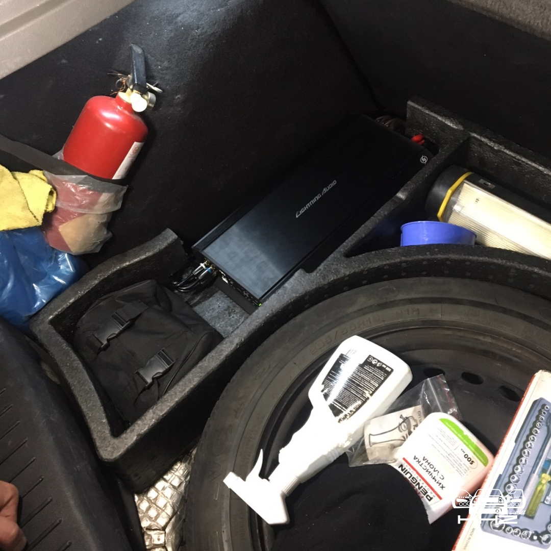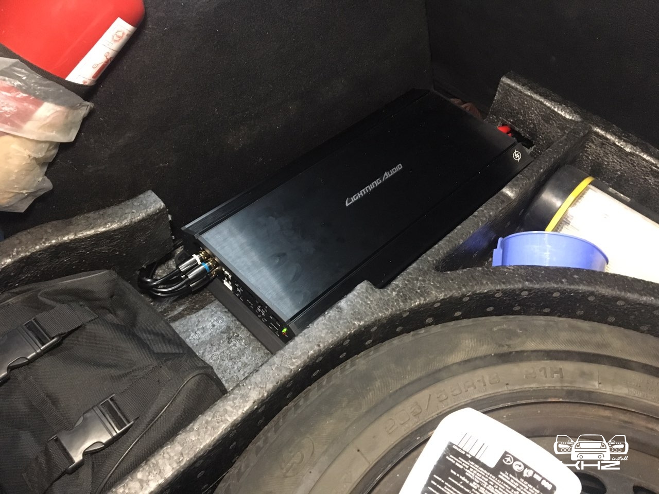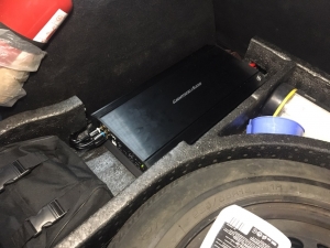 Ось так розмістилася встановлена нами акустика в даному автомобілі, збираємо двері і переходимо до встановлення автомагнітоли і підсилювача звуку, в даній інсталяції сабвуфер не присутній, так як дуже маленький багажник, замовник категорично налаштований на встановлення короба, який забере місце, що залишилося в багажнику. Підсилювач звуку, щоб він не сильно заважав у салоні або багажнику, було вирішено встановити під підлогою в ніші з пінопласту. Щоправда її потрібно було трохи доопрацювати, щоб кути не повністю закривали тепловідводи підсилювача звуку в Ford Focus. Підсилювач був обраний невисокої потужності і лінійки фірми Lightning Audio.