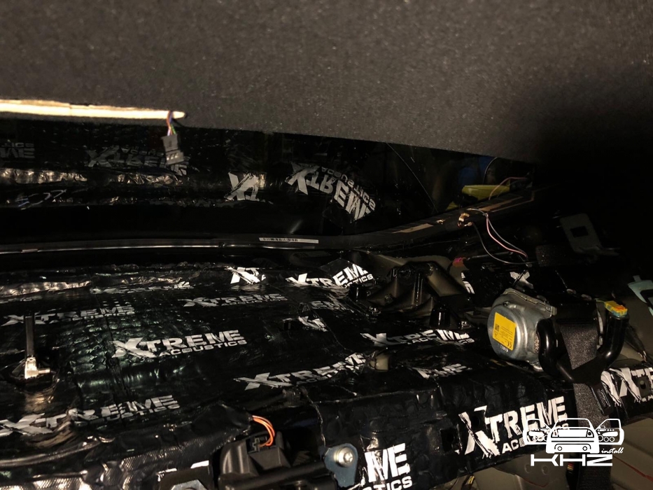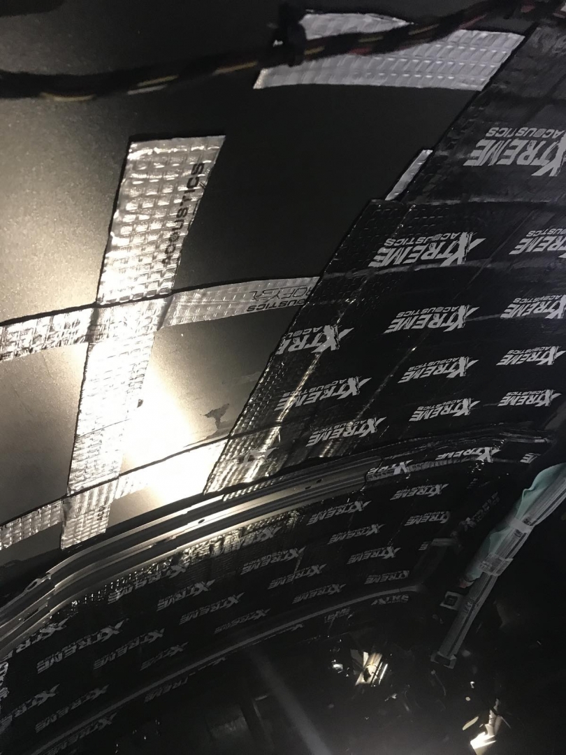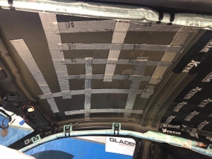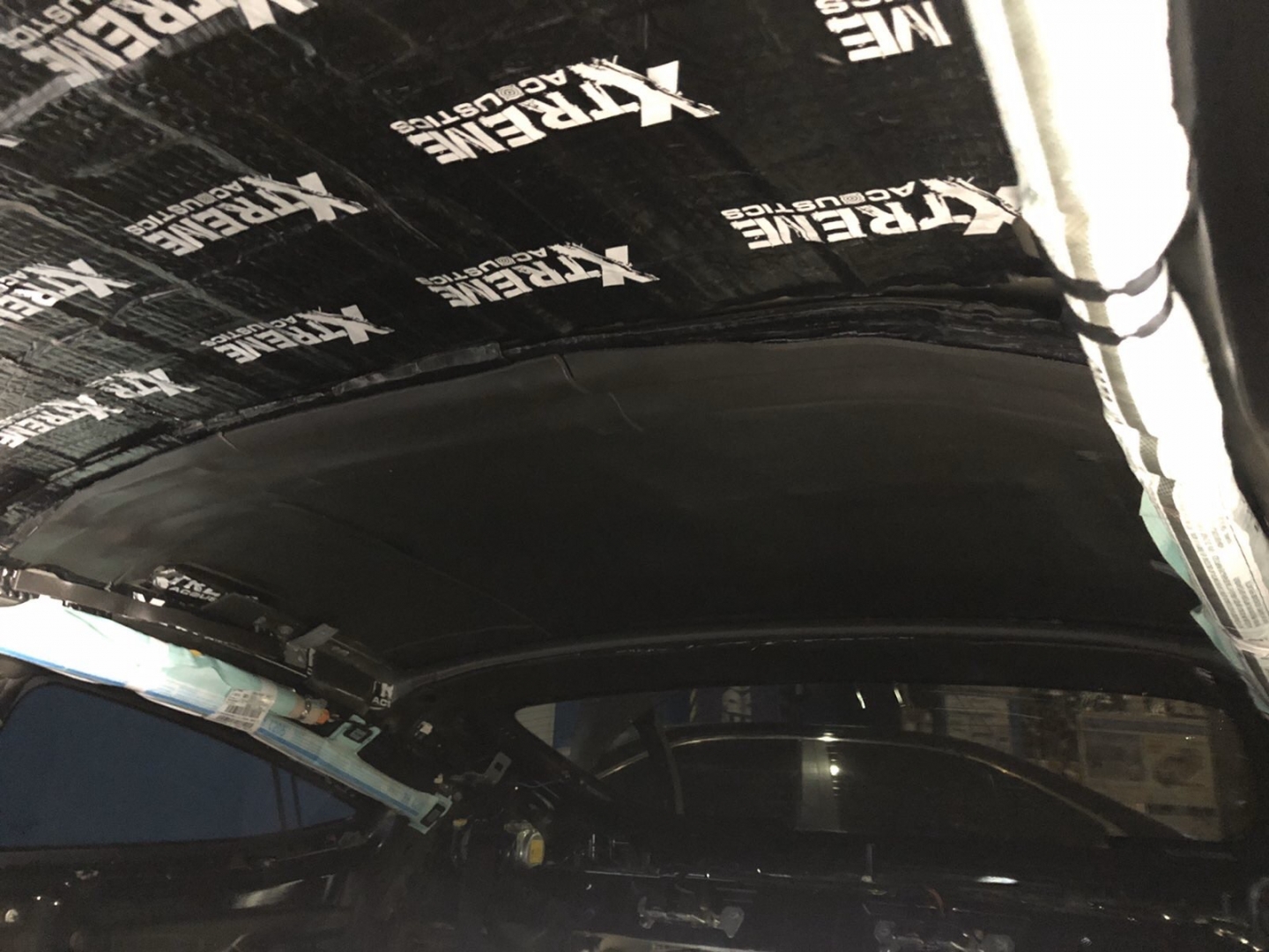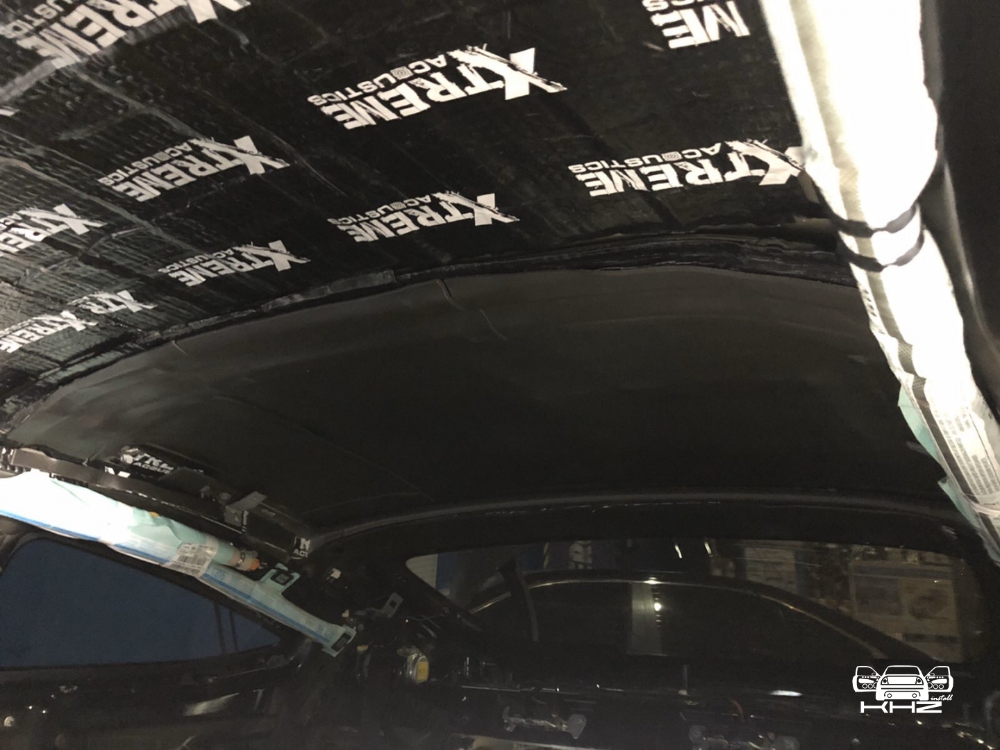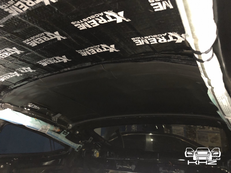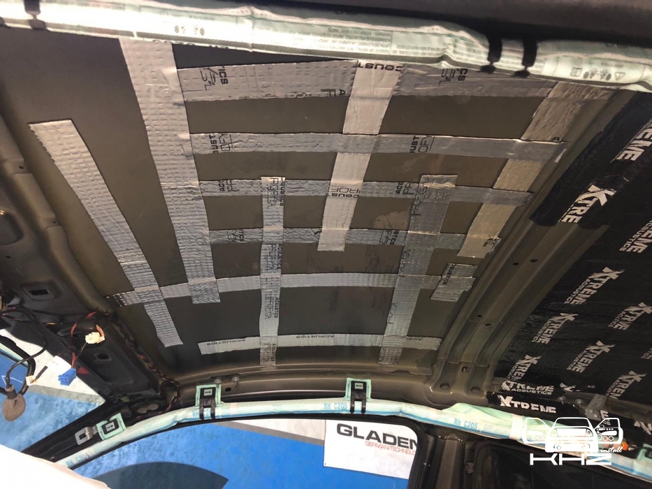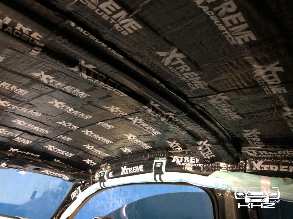 Насамперед, звісно, робимо дах автомобіля, оскільки автомобіль потрібно робити зверху вниз, щоб не зіпсувати матеріали, ті, що вже нанесли знизу, після розбору даху автомобіля стало зрозуміло, що він доволі великий, а ребер жорсткості - реально немає. Значить ми їх зробимо, оскільки під час набору швидкості, дах починає плавати через опір вітру, і через це з'являються сторонні гули. Проводимо армування даху, пластами жорсткої віброізоляції, щоб зробити міцний каркас. І поверх цього каркаса наносимо вже полегшений матеріал Acoustics Xtreme, товщиною 2 мм, ми заклеюємо весь дах, щоб, так би мовити, ніде не пропустити шум) Після того, як зробили шумоізоляцію даху Mercedes вібропоглинаючими матеріалами, переходимо до третього етапу - обклеювання тепло-шумоізолятором Soft, який дасть змогу зберегти тепло взимку в автомобілі довше, а влітку так само триматиме прохолоду кондиціонера. Обклеюємо весь дах - і у нас по ньому все, збираємо і перед цим ще перевіряємо всі дроти на антискрип, щоб нічого не деренчало і збираємо.