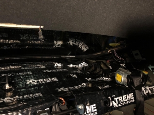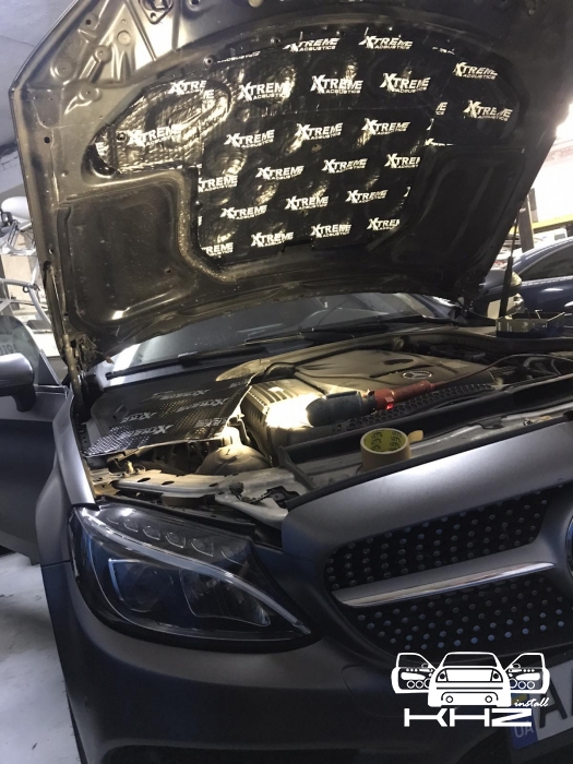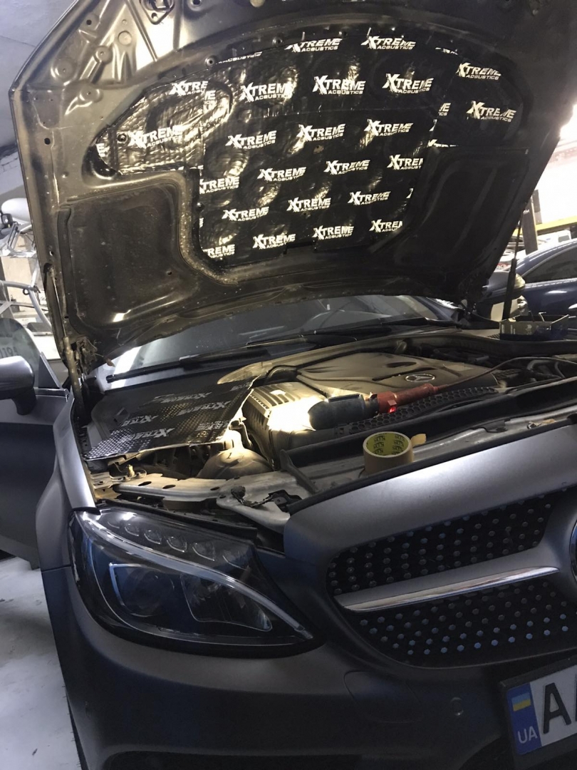 Далі ми переходимо на капот, він має не маленький розмір, і так само потребує обробки, щоб запечатати шум двигуна під капотом, і тільки на високих оборотах було чутно двигун. Так само робимо в два шари, шар віброізоляції полегшений і шар тепло-шумоізолятора, потім весь цей простір закривається штатним щитом захисним, тому нічого не видно під капотом, але результат є. З цим закінчили, і капот Mercedes c-klass зашумлений.