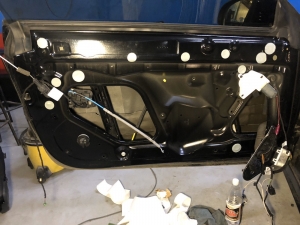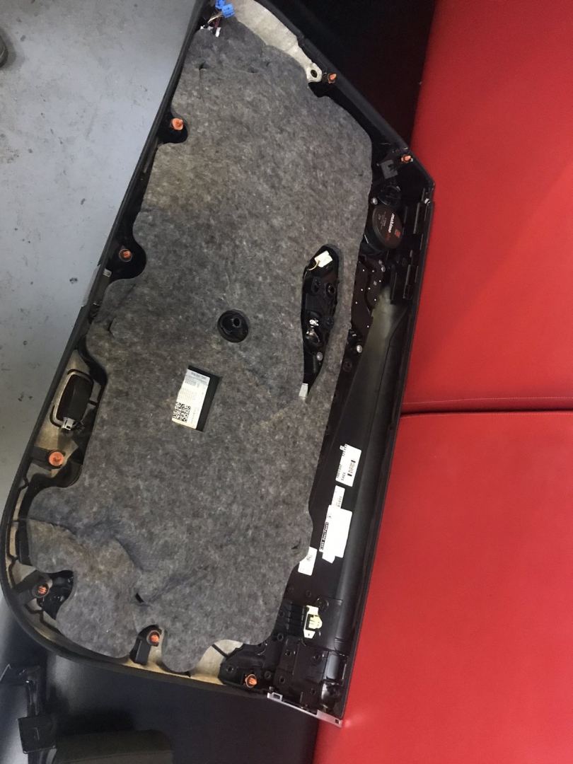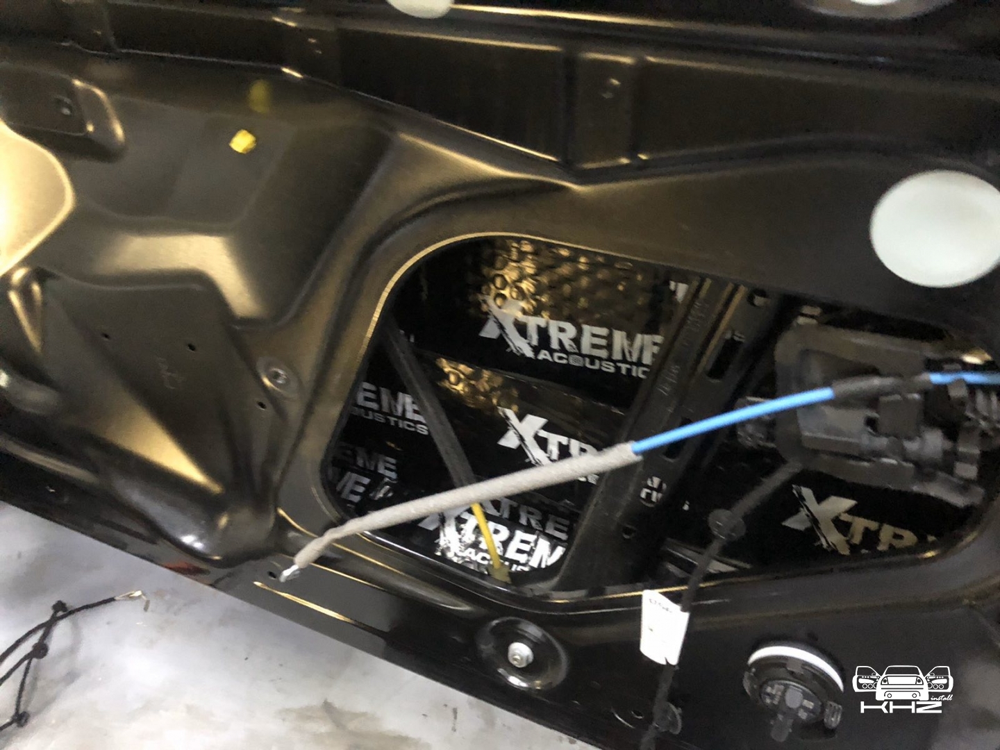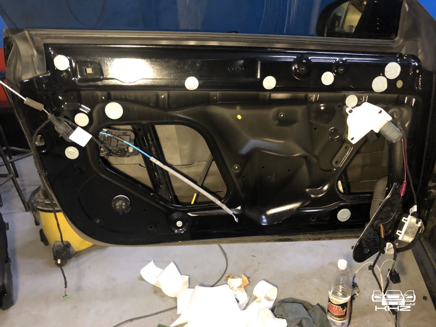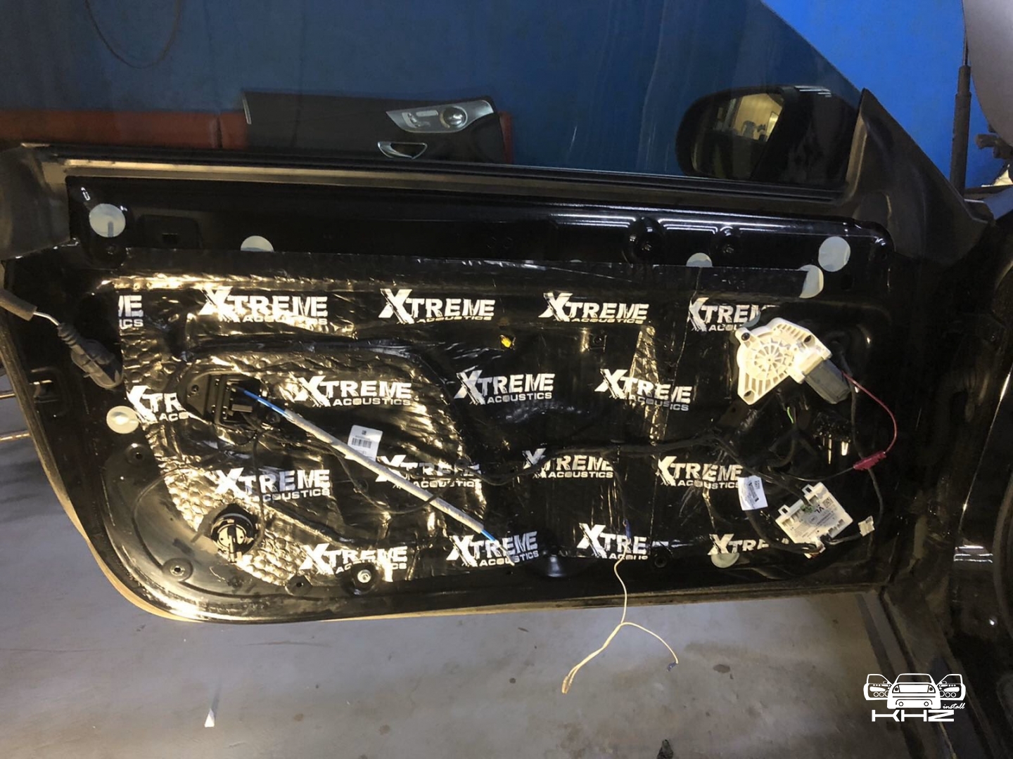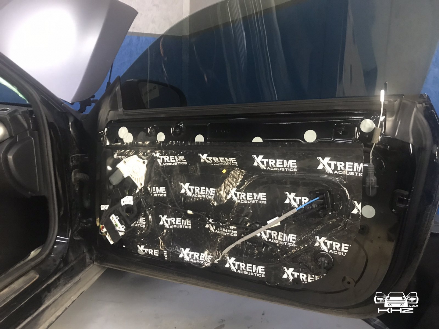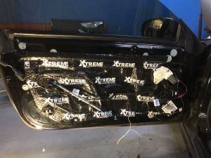 Наступний елемент це двері, двері в автомобілях класу купе займають більше половини салону, і тому через них чути багато чого ззовні, їх, звісно, ми так само обклеюємо, єдина відмінність від усіх інших елементів, які ми піддаємо шумоізоляції, це кількість шарів. Двері у нас обклеюються в 4 шари, це максимальна шумоізоляція дверей і так би мовити правильна за технологією. Два шари віброізоляції, внутрішню частину і фільонку дверей, обклеюємо повністю, і таким чином робимо ще правильне акустичне оформлення дверей, що завжди призводить до максимально хорошої роботи акустики! Це не менш важливо, тому що під час шумоізоляції ви отримуєте не тільки комфорт, а й краще і глибше звучання акустики. Потім шар Soft - це тепло-шумоізоляція і повне доопрацювання пластикової карти, методом армування пластику віброізоляцією, а потім повністю обклеюємо м'яким хвилястим матеріалом, для того, щоб забити всі простори, де може пройти шум, і для повного антискрипу карти з металом.