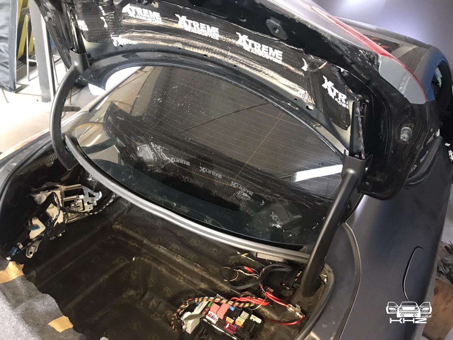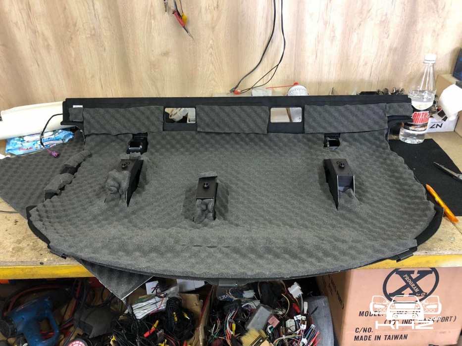 Йдемо далі і наступний елемент, який ми доопрацьовуємо, - це полиця, вона дуже не маленька, як для автомобіля купе, і, звісно ж, це вплине на сторонній шум під час потрапляння в яму або їзді по бруківці. Полицю демонтують і всю закочують віброізоляцією, далі всі дроти і стики обклеюють м'якими матеріалами, а саму полицю збирають шматками віброізоляції і повністю обклеюють м'яким хвилястим шумопогнічувачем, який зупинить шум і не дасть пластику тертя з виперуючими елементами. Полиця готова і збирається на своє місце.