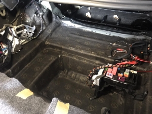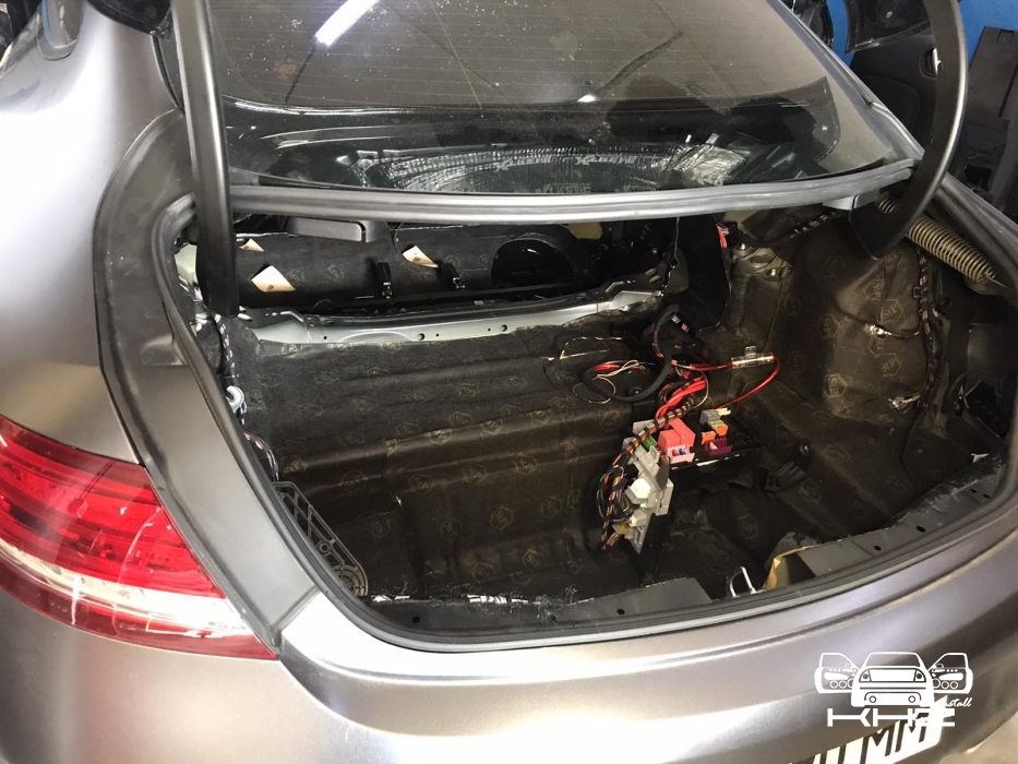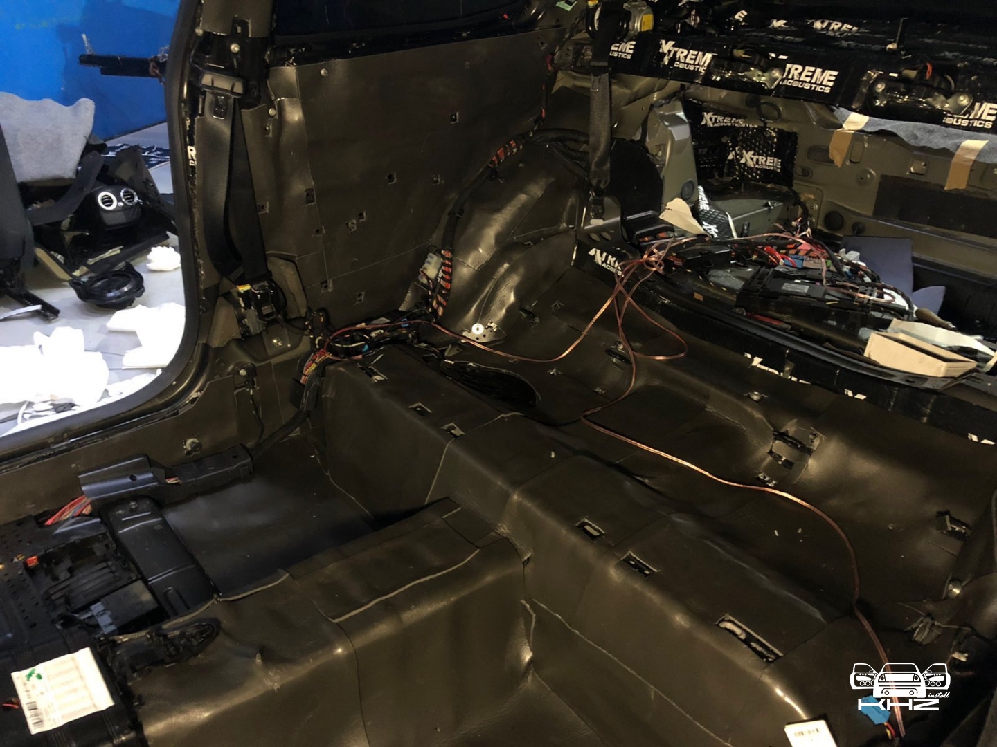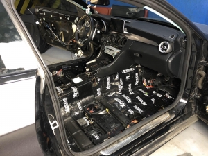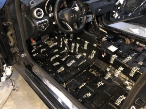 Ось знаєте іноді приїжджає замовник і каже - мене турбує полиця і двері, або арки - але ж ця машина, шуміла вся, та друзі це ж Mercedes! І так завдання стояло зробити її максимально тихою, а це в той же час і комфортною, і так само не обтяжувати її максимально. Прийнято, нами було запропоновано варіант зробити її всю полегшеною віброізоляцією фірми Acoustics серії Xtreme, що важить на 30% легше і має дуже високий коефіцієнт поглинання шуму, і днище зробити не в 2 шари як завжди, а в 3 шари з використанням матеріалу Noise Block, який не залишить шансів шуму - знизу автомобіля.