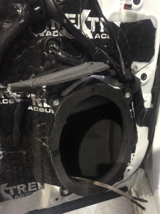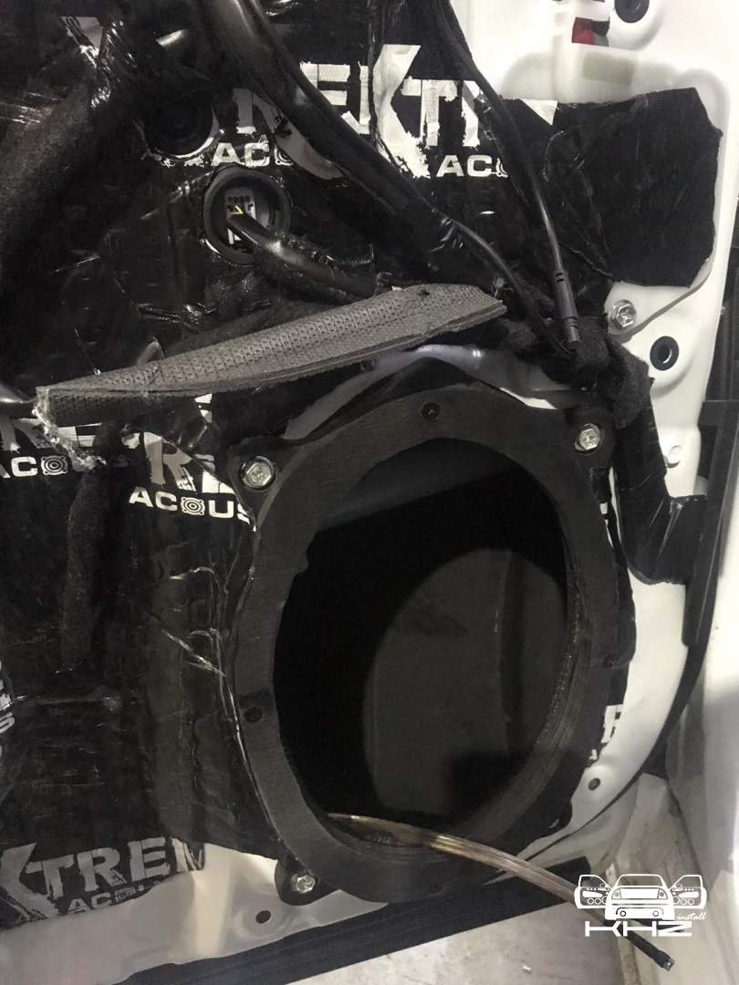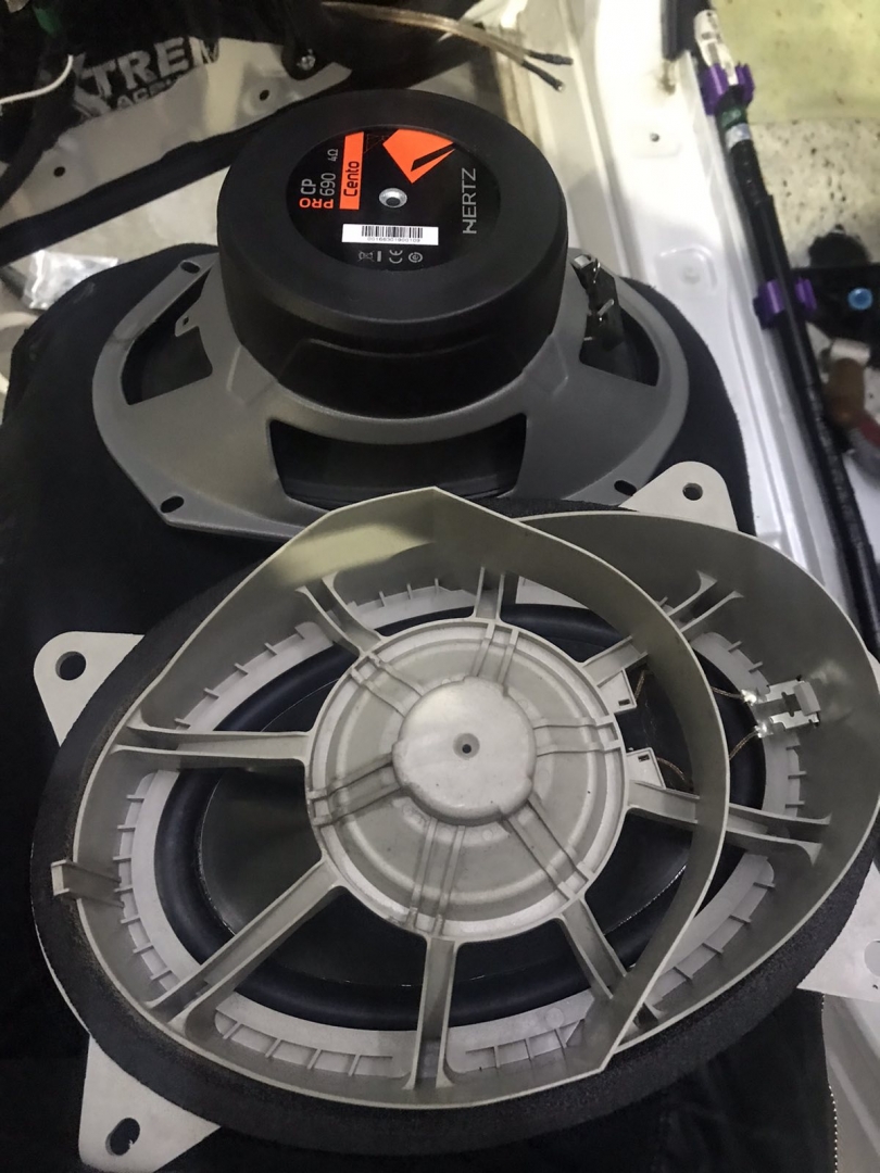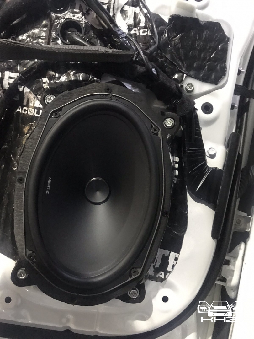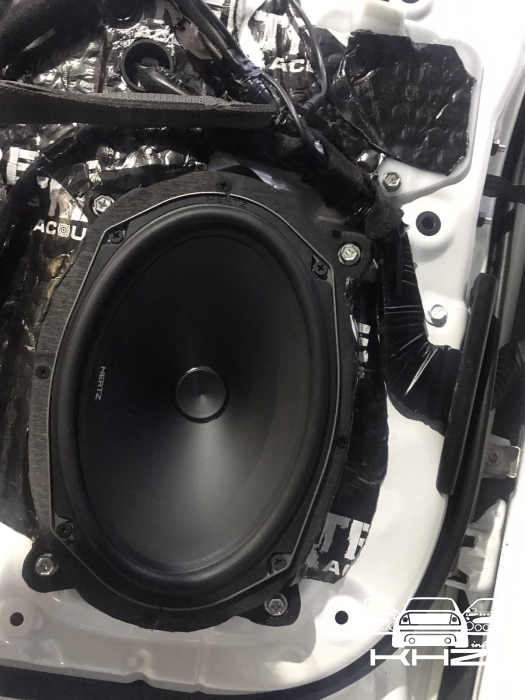 Далі у нас стояло ще завдання мінімально поліпшити звук в Lexus CT 200H, продзвонивши проводку, стало зрозуміло що виносного підсилювача звуку тут немає. АЛЕ магнітола ріже канали по-своєму, тобто сигнал на всі динаміки йде різний, якщо ж ставити акустику через кросовери, які ще поріжуть звук вдруге, - то результат на виході буде ще гіршим. Тому у нас є таке рішення, в передніх дверях стоять овальні мідбаси - ми їх так само міняємо на такі ж овали, тільки в рази якісніше, мідбаси ми вибрали бренду Hertz, щоправда, вони окремо не продаються, ми розукомплектували комплект акустики Hertz CPK 690. Для встановлення мідбасів ми виготовили проставочні кільця з фанери, 2-х складові і пофарбували щоб мали приємний зовнішній вигляд. Встановлені мідбаси мають такий вигляд: