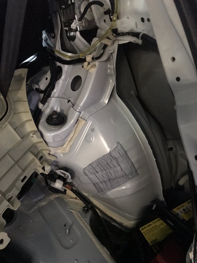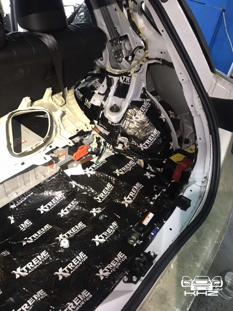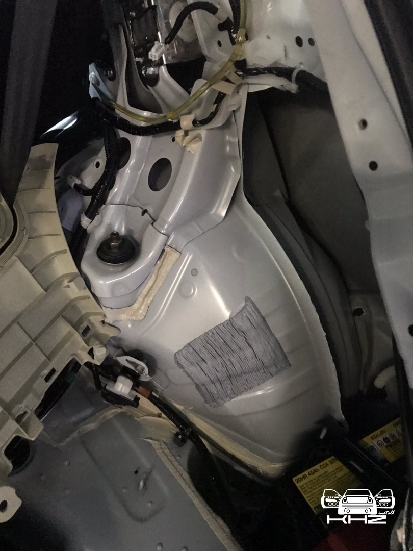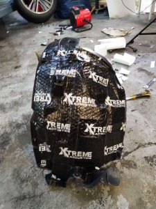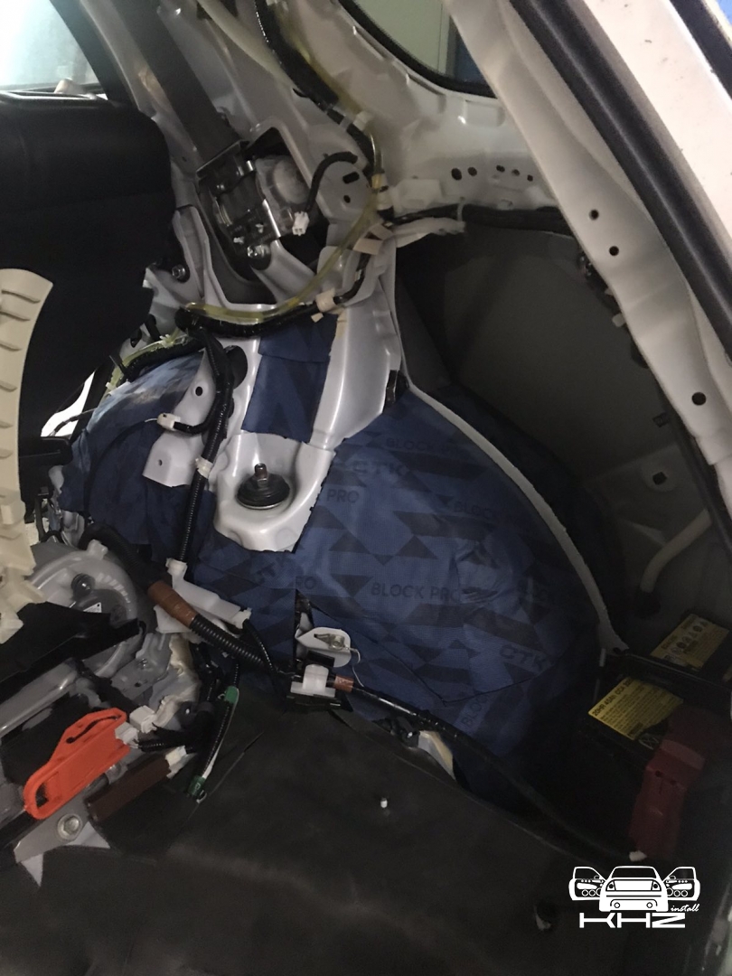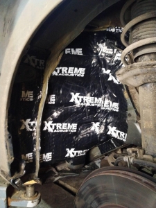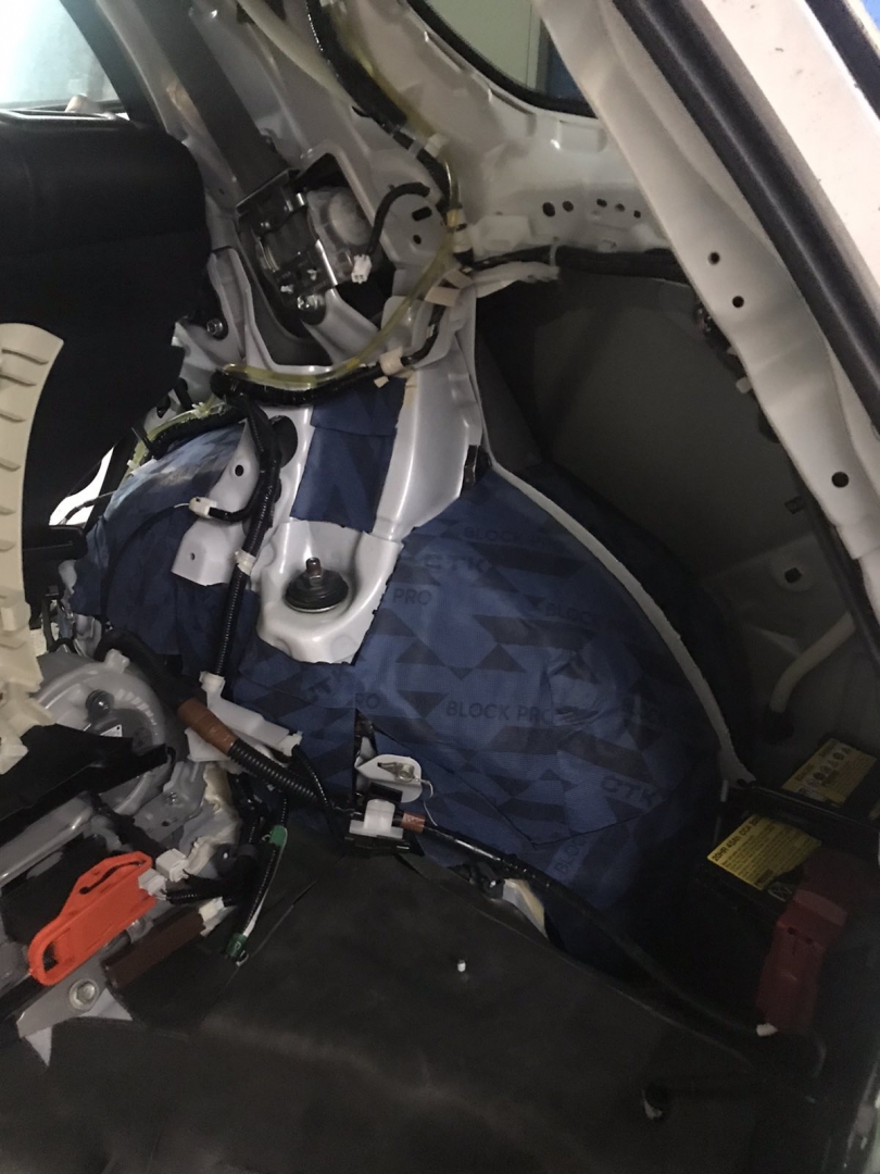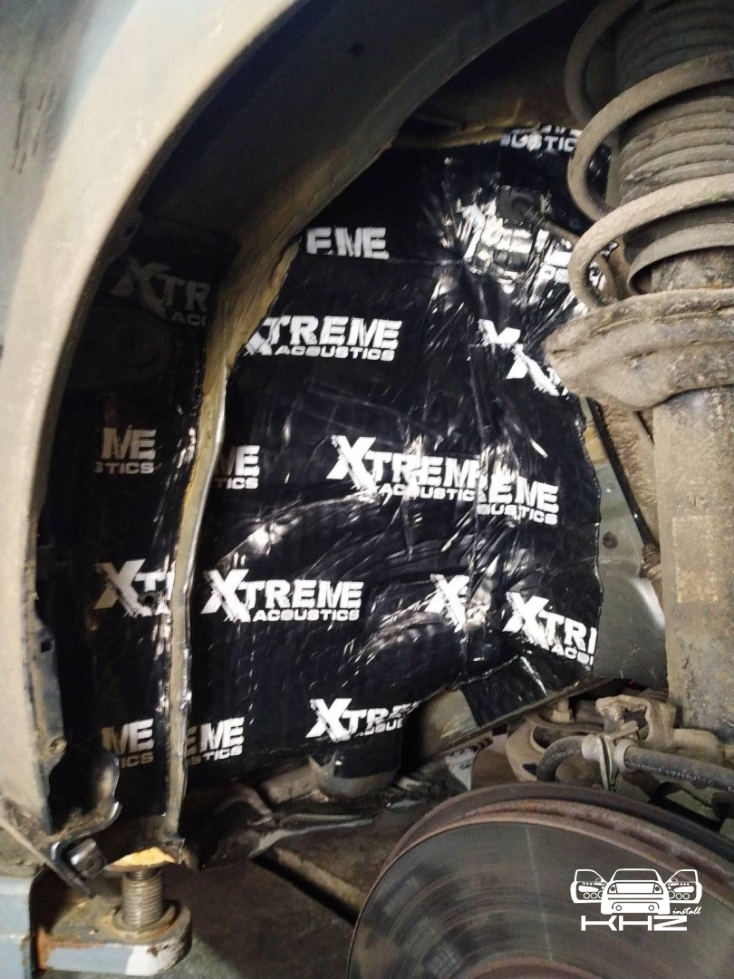 Наступний елемент це днище багажника і арки, гарненько укладаємо матеріали, такої самої товщини, як і в салоні, єдине, що аркам надаємо особливу увагу, бо вони пропускають максимально шуму, ми їх зробили в три шари, перший - це віброізоляція, другий - це теплошумоізолятор, а третій - це нойс блок, який не дає шуму вже жодного шансу потрапити до салону, ця технологія може і використовуватися для всього днища автомобіля, але це вже для іншого бюджету. Так само ми зробили віброізоляцію передніх арок зовні автомобіля, так як з салону передні арки укочуються чучуть, з причини що їх мало зсередини. Ми знімаємо підкрилок, добре вимиваємо метал і підкрилок, потім вкочуємо той самий матеріал щільним шаром на метал, і закочуємо підкрилок віброізоляцією, тим самим глушимо звук, який підкрилок передає від потрапляння щебеню, води і піску, це дуже відчувається - ми збираємо відгуки, і це дуже популярна послуга у нас! Реально йде шум коліс і шуми від зовнішніх подразників.