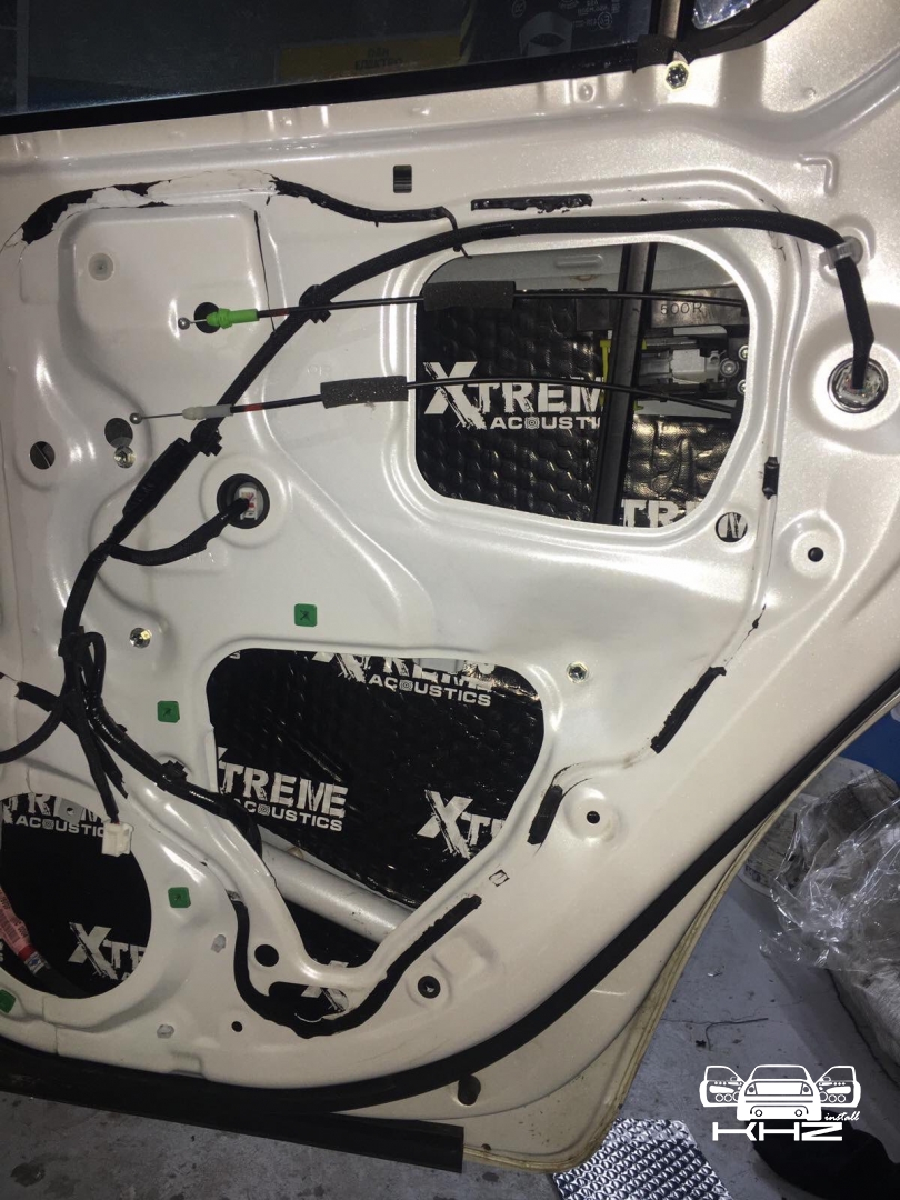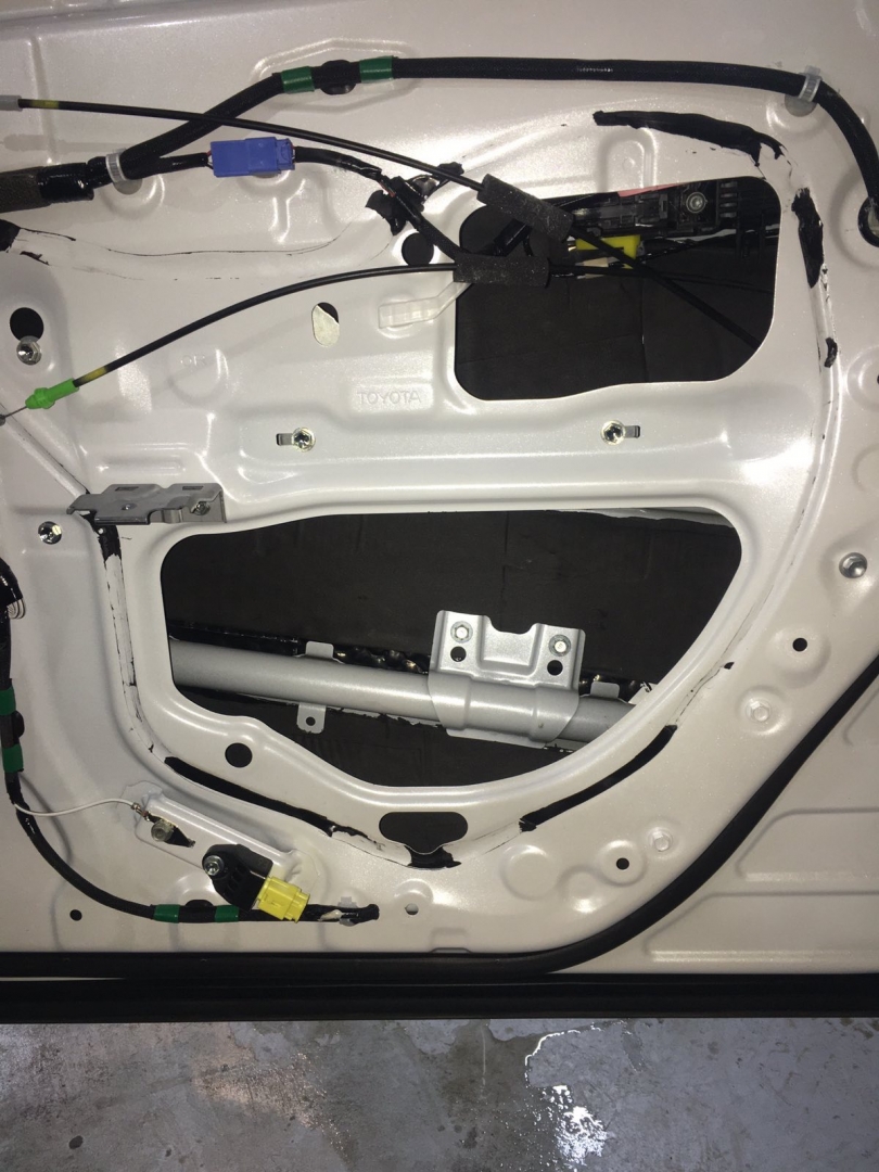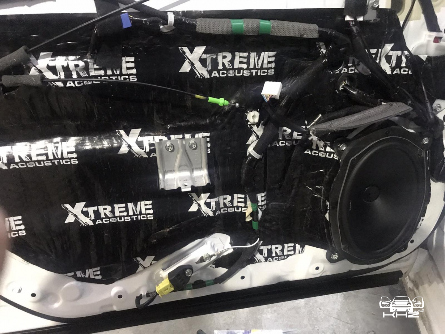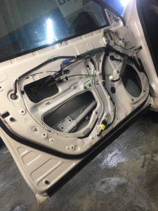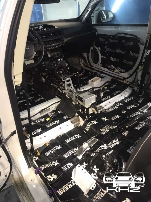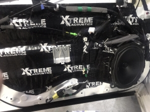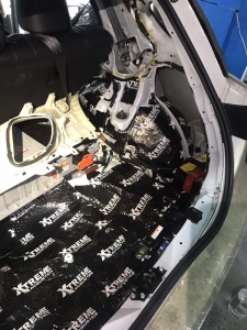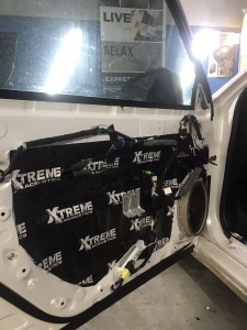 Почнемо з дверей, шумоізоляція дверей Lexus CT200 відбувається в 4 шари, за таким принципом наша Студія робить практично всі автомобілі, по шумоізоляції, так як тут пересікаються і шумопридушення, і антискрип пластику, і проводів, і так само теплоізоляція. Перший шар - це зовнішня частина дверцят, найглибша і найважча в обробці частина, оскільки отвори не дуже великі, і потрібно потроху вирізати і вклеювати матеріал всередині дверцят. Перед цим ми знежирюємо поверхню, на яку наносимо віброізоляцію, щоб вона максимально добре приклеїлася і на завжди. До речі, замовник попросив знешумити автомобіль полегшеною віброізоляцією, щоб не максимально обтяжувати автомобіль, для цього завдання ми використовували преміум-матеріали бренду Acoustics Xtreme, ці матеріали на 25% легше, ніж звичайна віброізоляція.