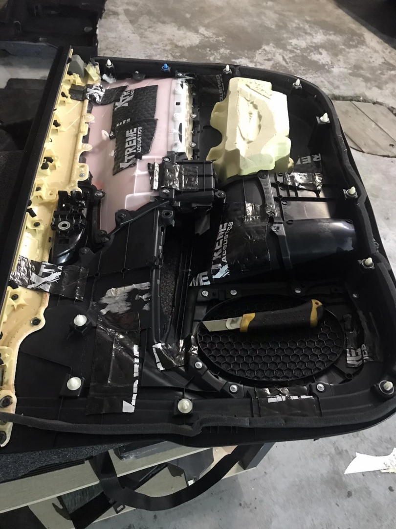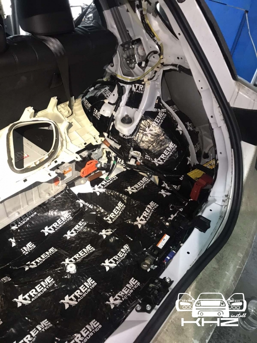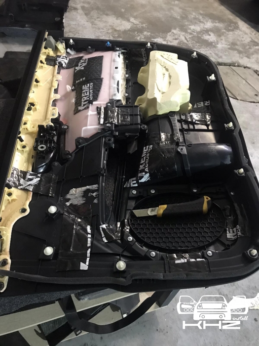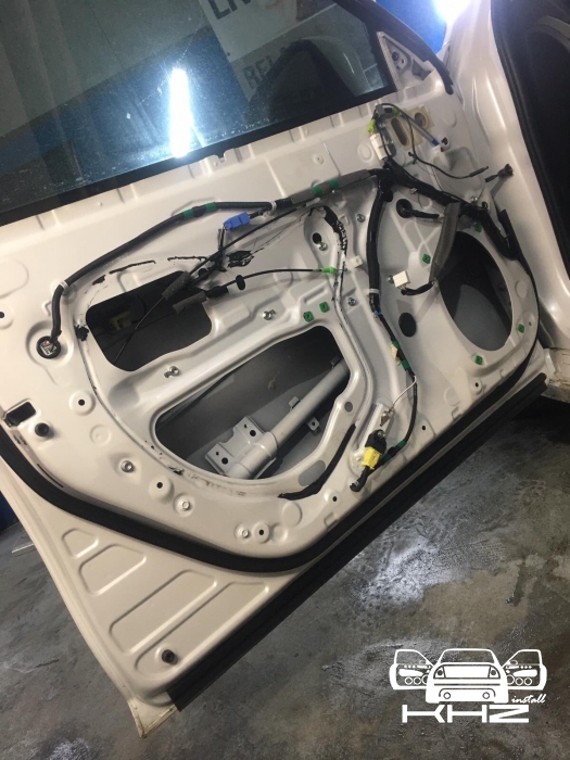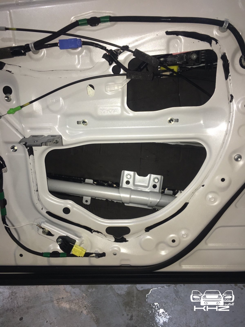 Почнемо з дверей, шумоізоляція дверей Lexus CT200 відбувається в 4 шари, за таким принципом наша Студія робить практично всі автомобілі, по шумоізоляції, так як тут пересікаються і шумопридушення, і антискрип пластику, і проводів, і так само теплоізоляція. Перший шар - це зовнішня частина дверцят, найглибша і найважча в обробці частина, оскільки отвори не дуже великі, і потрібно потроху вирізати і вклеювати матеріал всередині дверцят. Перед цим ми знежирюємо поверхню, на яку наносимо віброізоляцію, щоб вона максимально добре приклеїлася і на завжди. До речі, замовник попросив знешумити автомобіль полегшеною віброізоляцією, щоб не максимально обтяжувати автомобіль, для цього завдання ми використовували преміум-матеріали бренду Acoustics Xtreme, ці матеріали на 25% легше, ніж звичайна віброізоляція.