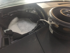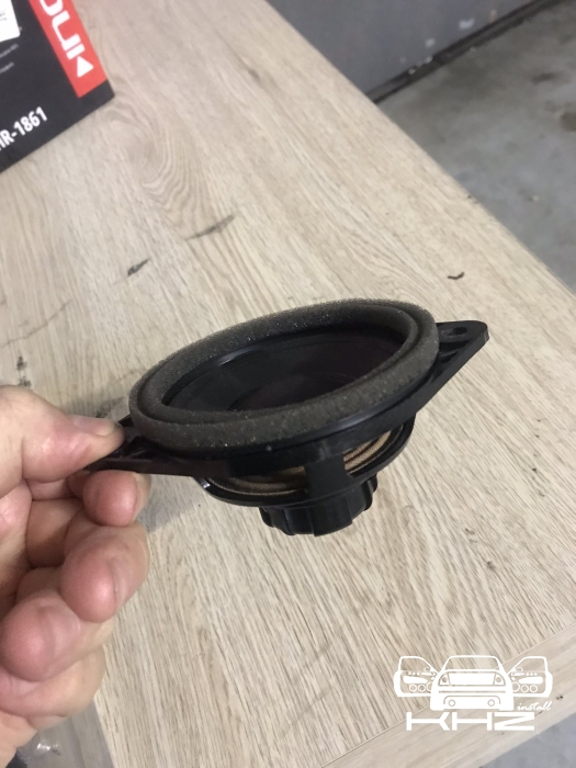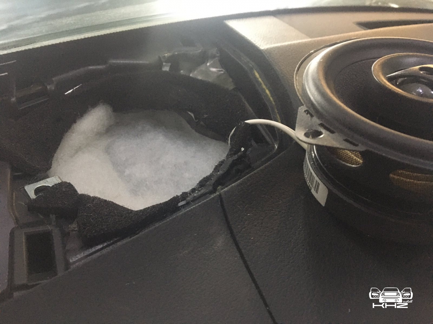 Переходимо до акустики, яка стояла в торпедо - це широкосмугові динаміки, які хочуть грати і як твітер, і як НЧ-динамік, але в підсумку йде каша, звучання пластикове і розмите. Для вирішення цієї задачі нам знадобитися коаксіальний динамік розміром 10 см, який відіграє і середні частоти, і високі, ми привезли кілька комплектів, але не всі стають туди за посадкою та глибиною, підійшли Morel maximo 4 coax, щоправда, встановлення було з доопрацюванням пластику та самого динаміка, залишилося тільки кілька кріплень, також ми підкотили посадку віброізоляцією, а в нішу вклали сінтіпон, щоб збільшити об'єм для динаміків.