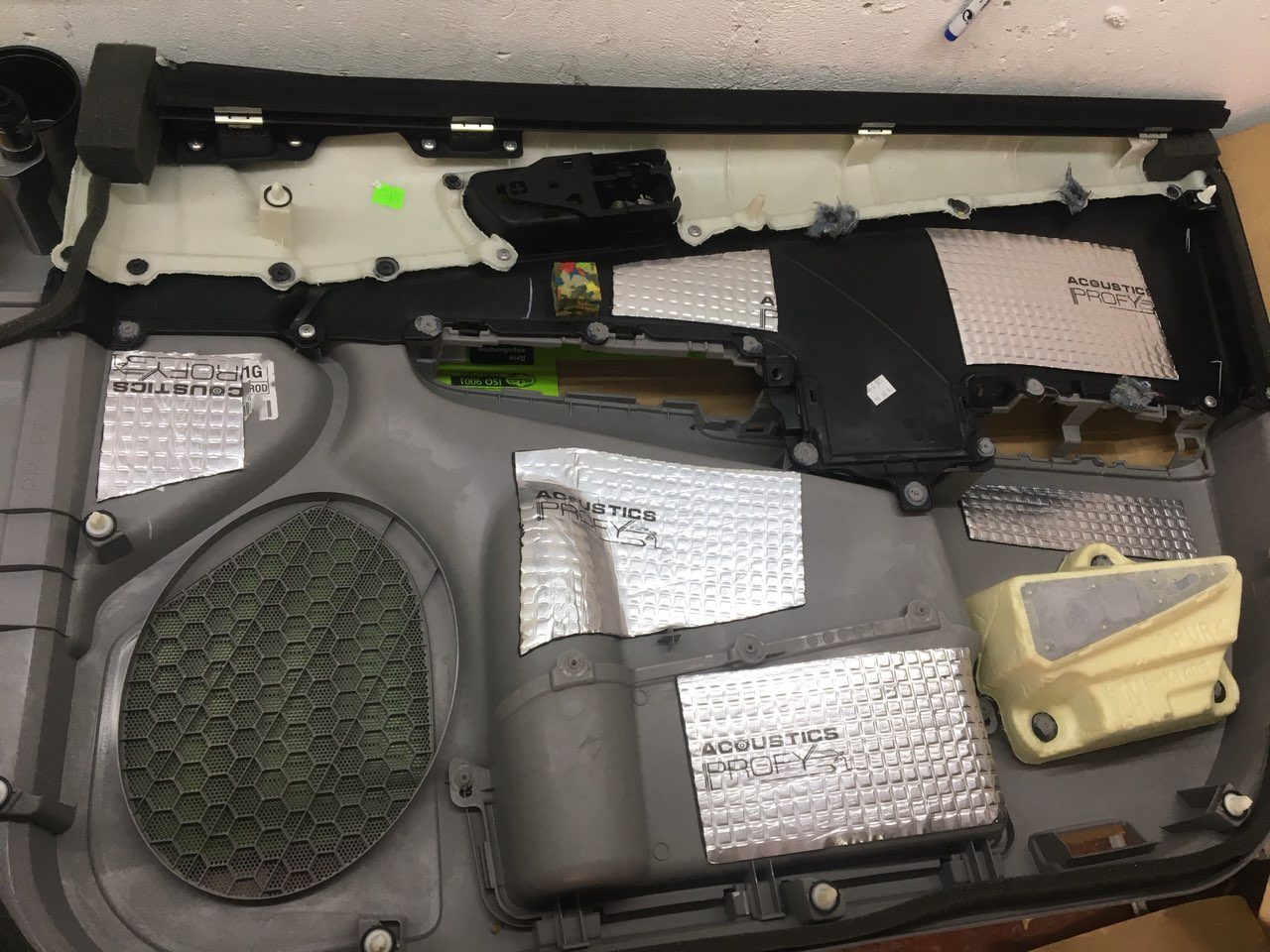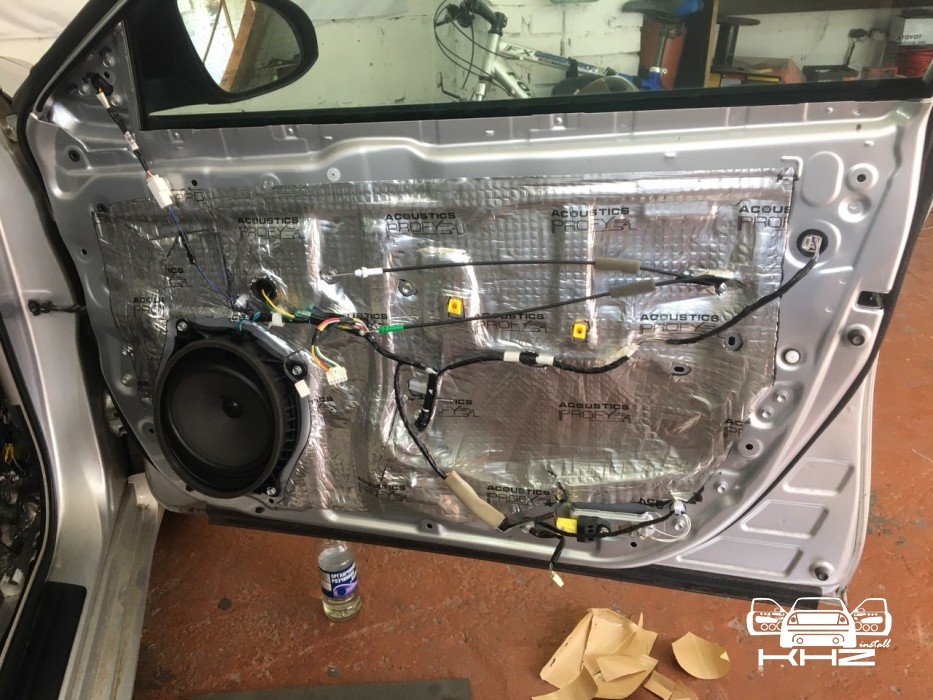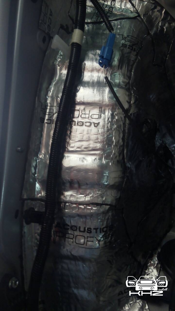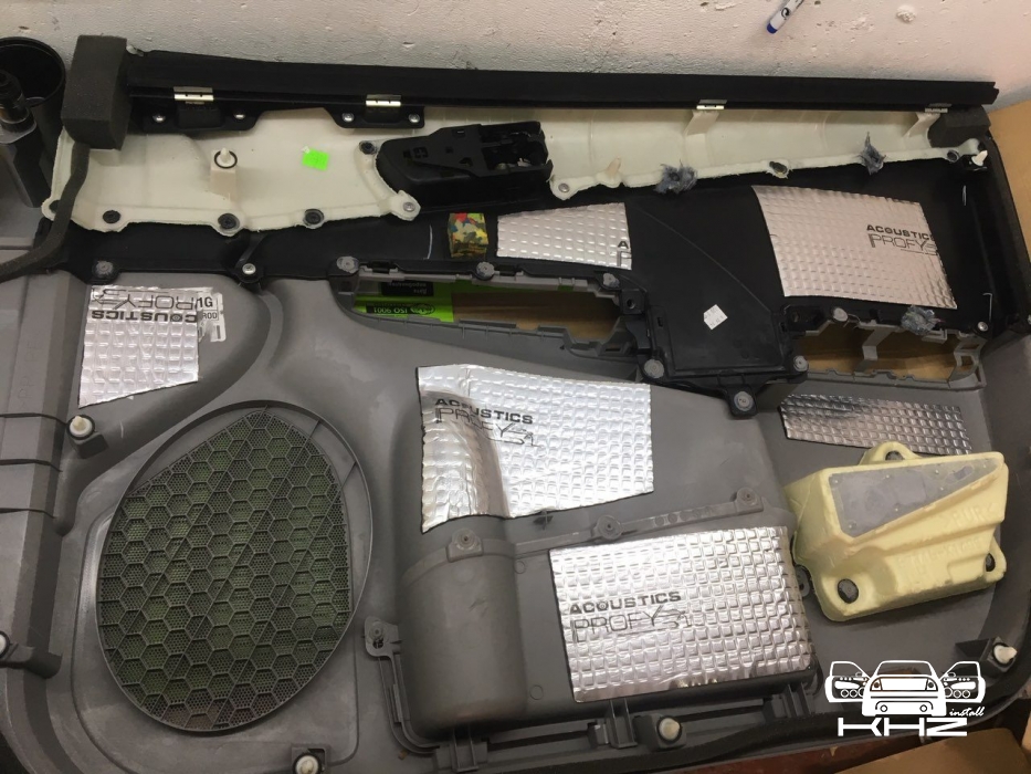 Починаємо готувати двері до шумоізоляції, миємо, знежирюємо, клеїмо і викочуємо віброізоляцію Acoustics Profy A2, товщиною 2.2 мм. На нього клеїмо сплен 4 мм, що повністю заб'є шуми.