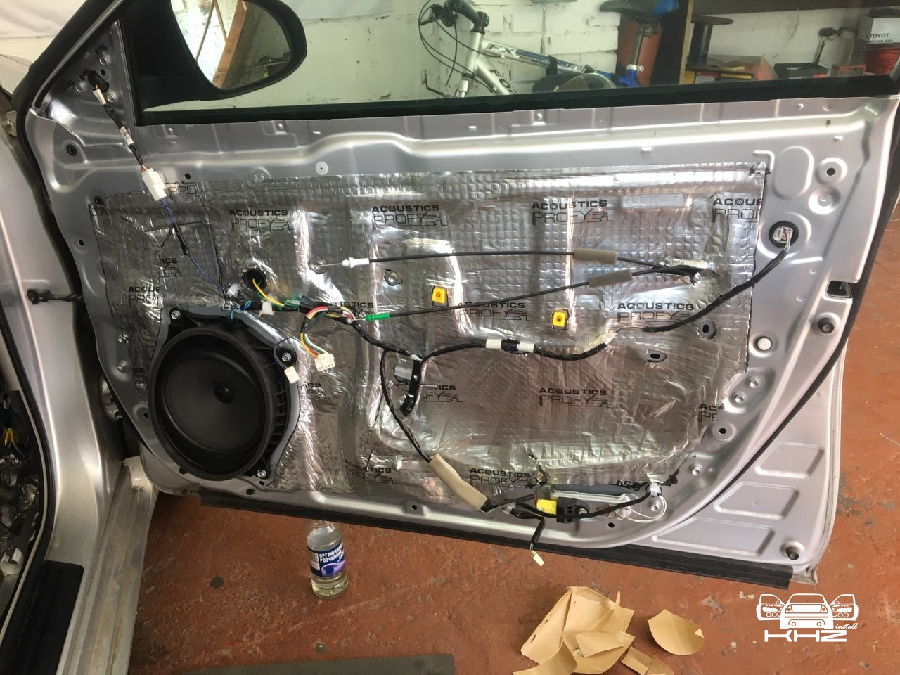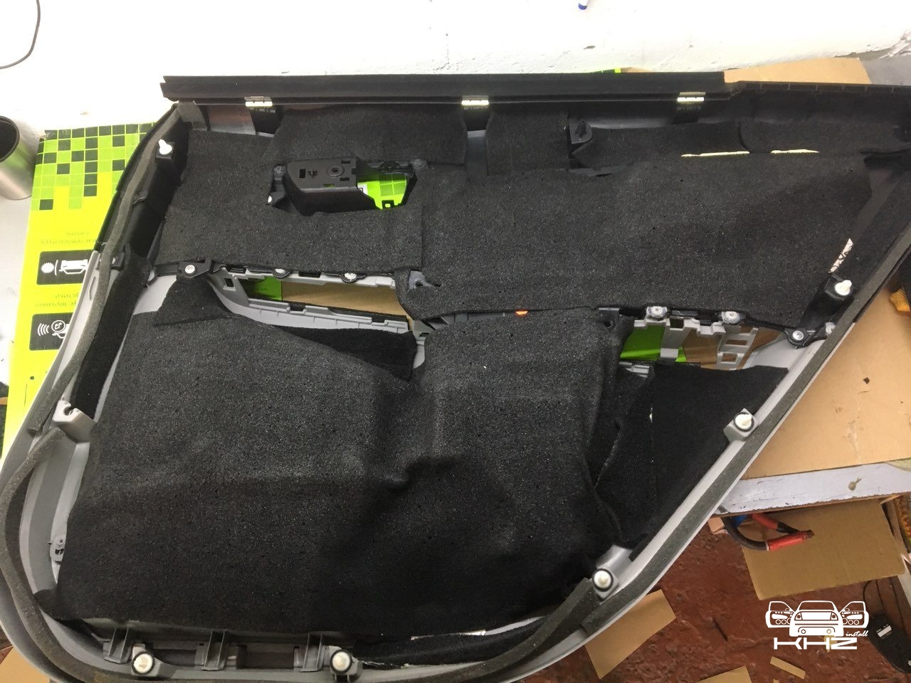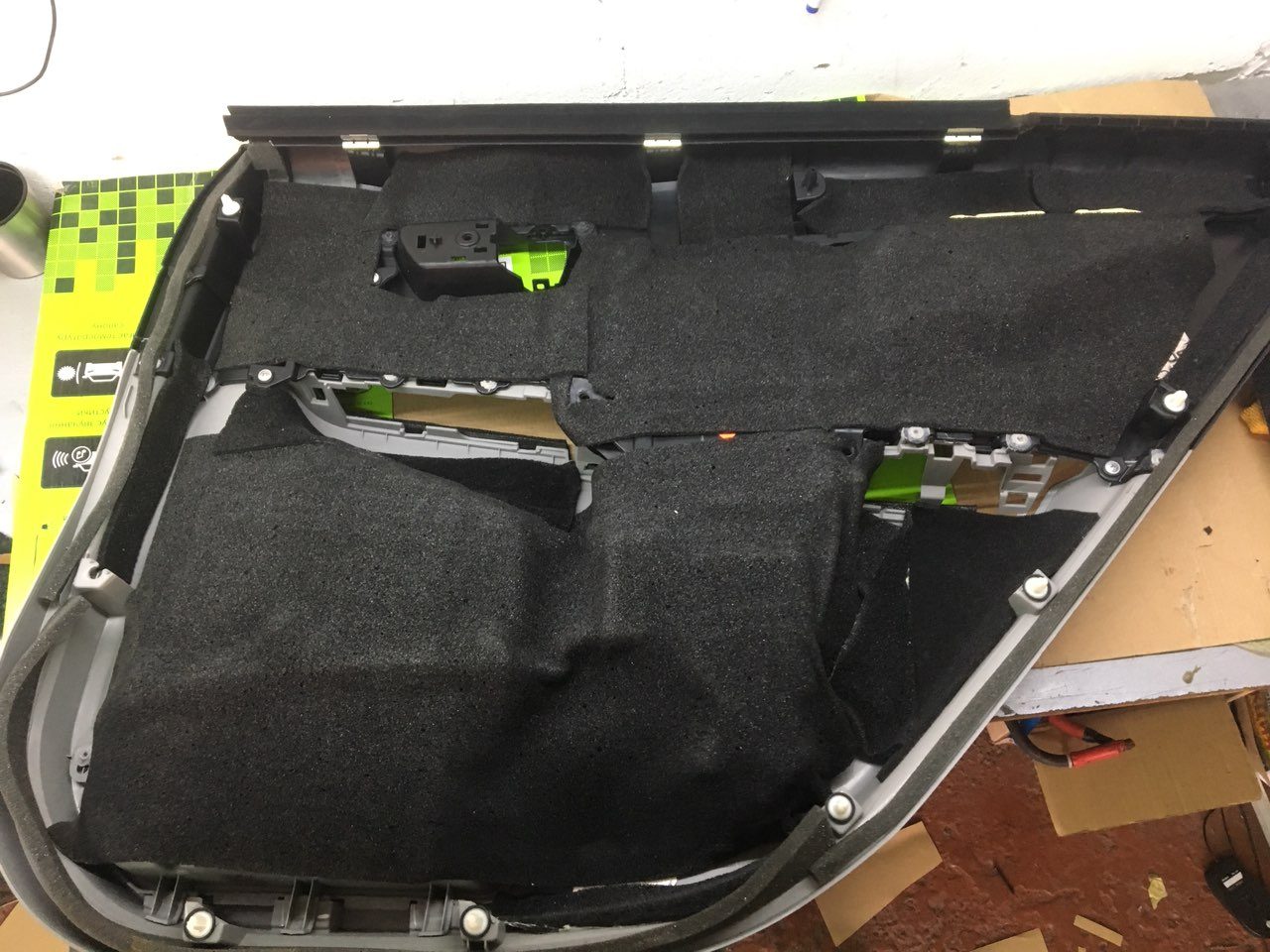 Починаємо готувати двері до шумоізоляції, миємо, знежирюємо, клеїмо і викочуємо віброізоляцію Acoustics Profy A2, товщиною 2.2 мм. На нього клеїмо сплен 4 мм, що повністю заб'є шуми.