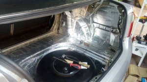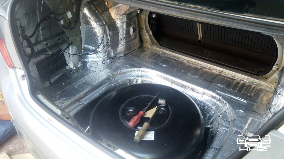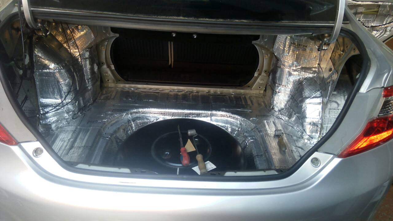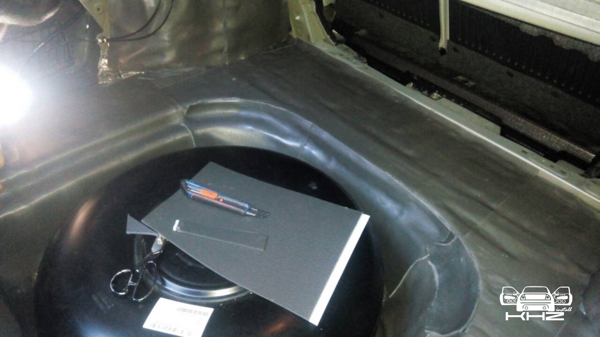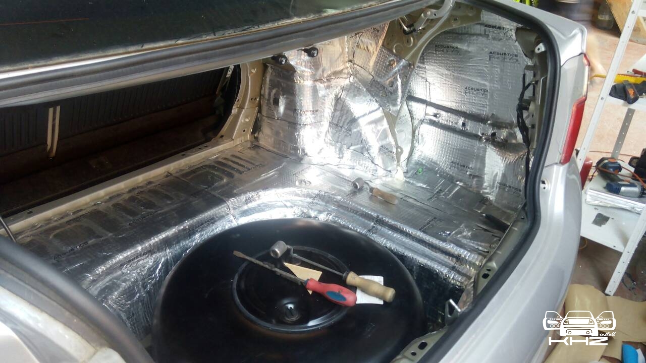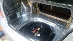 Багажник закатаний повністю двома матеріалами, і тепер він не дасть про себе знати водієві та його пасажирам. Наступний етап це арки з салону і підкрилки, цей вид шумоізоляції дуже ефективний, він прибирає шум дороги, звук від води, пісок, який летить з коліс, і каміння, тому рекомендуємо і вам спробувати. Всі арки робимо більш товстим матеріалом, щоб він поглинув більше шуму. Робимо задні арки, ті що з салону: