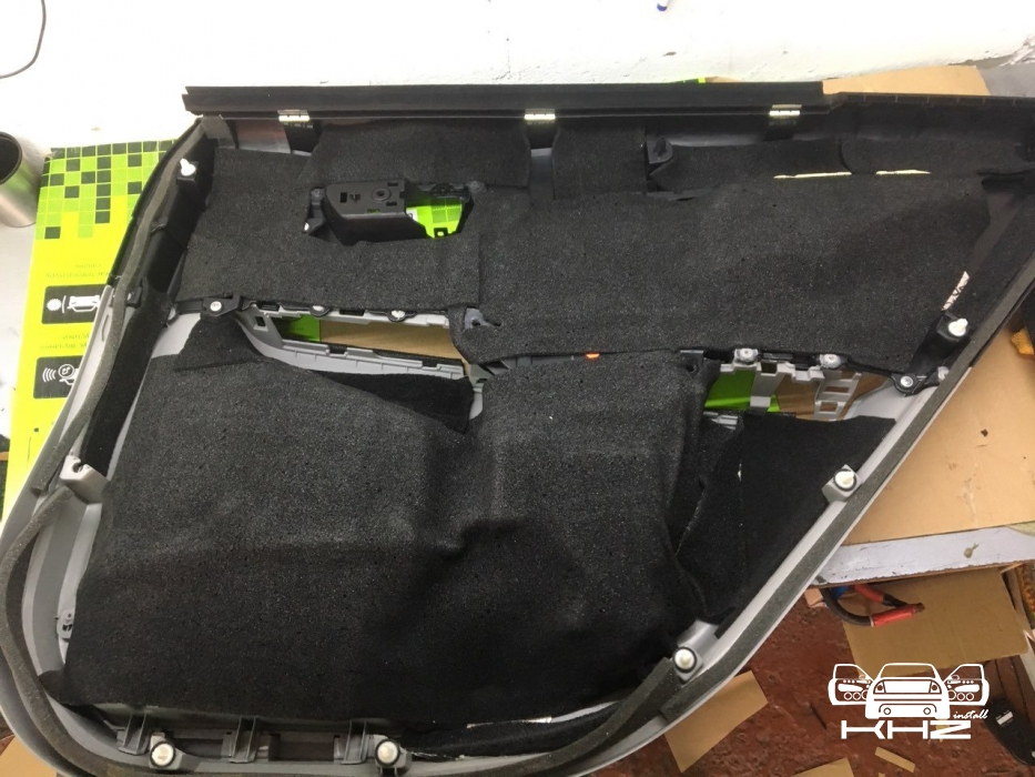 І в закінченні шумки дверей, ми допрацьовуємо пластикову карту, ми проклеюємо її шматками віброізоляції, щоб скріпити і погіршити карту, і потім закриваємо все полотно м'яким матеріалом на клейкій основі, так званим демпером, товщиною 5 мм.