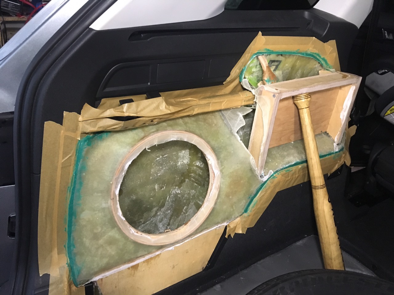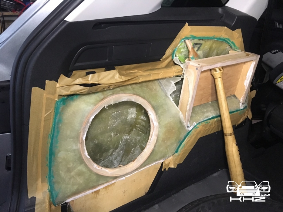 Тим часом обробляємо багажник і готуємо до обклеювання смолою і скломатом. Замовник попросив зробити так, щоб залишився поручень, і ніби був вбудований у сабвуфер, клеїмо за побажанням.