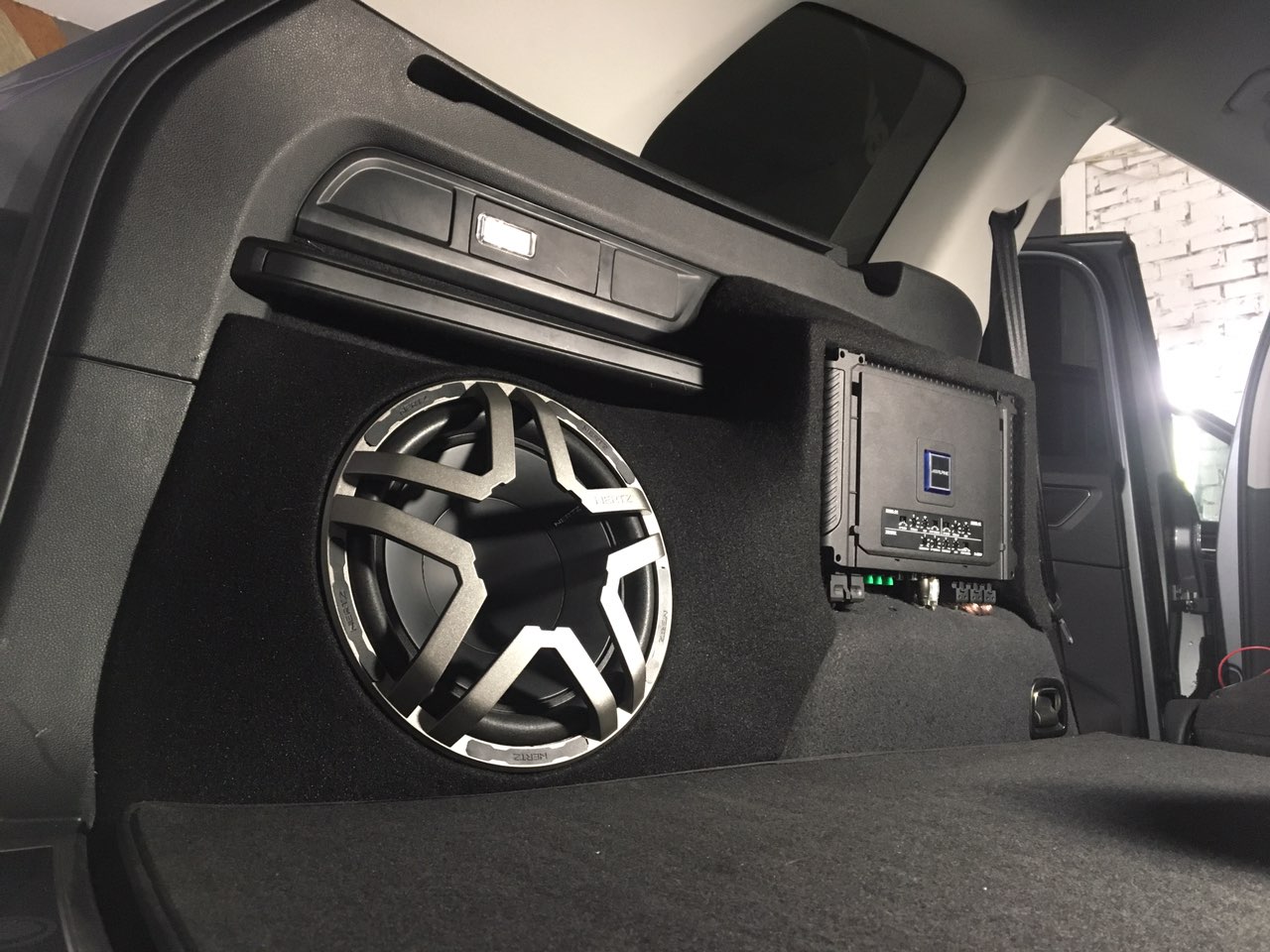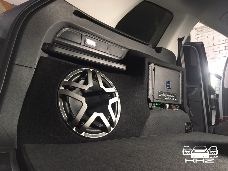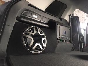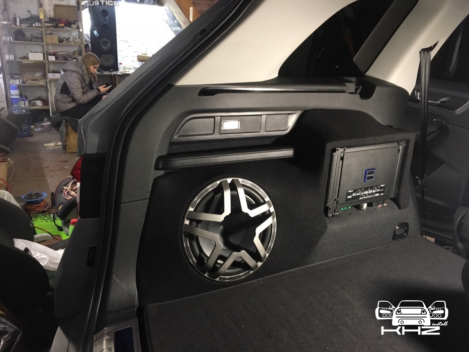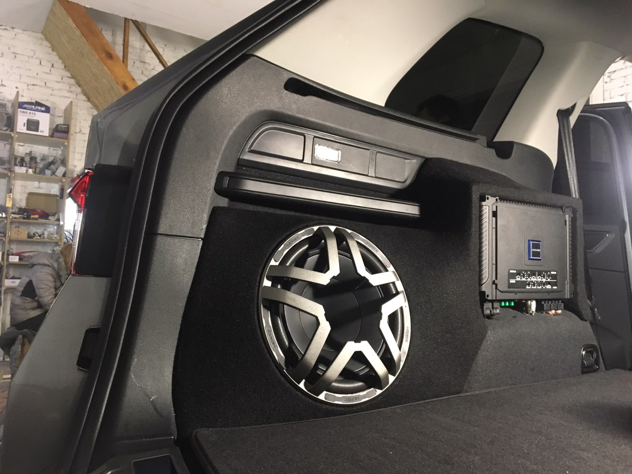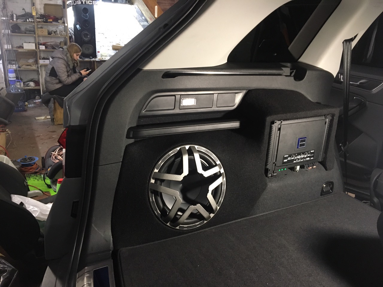 Короб сабвуфера відокремлений перегородкою від корпусу підсилювача, і має об'єм в 25 літрів, далі ми завели сабовий кабель в короб, поставили перемички на сабвуфері, так як він 2-х котушковий і буде працювати в 2Ом. І приступаємо до перетяжки нашого виробу для Skoda Kodiaq в чорний карпет, далі ми кріпимо наш мультикороб до металевих фільонок автомобіля, і правильно підключаємо підсилювач звуку в Skoda Kodiaq, на фініші презентуємо вам такий результат, над яким ми продуктивно працювали.