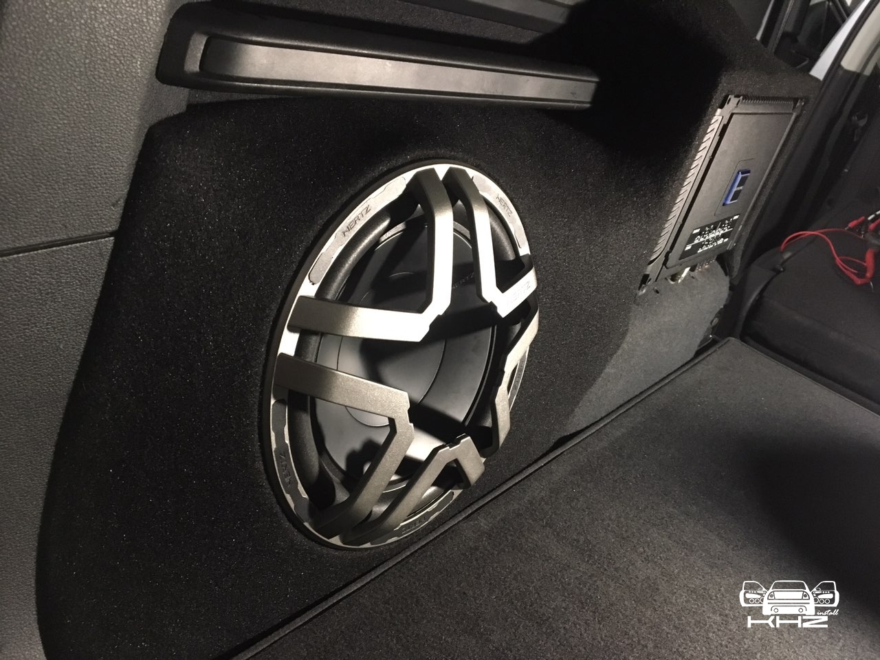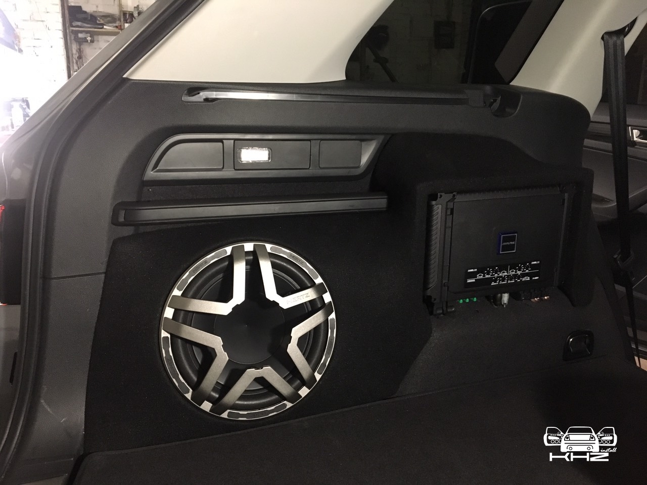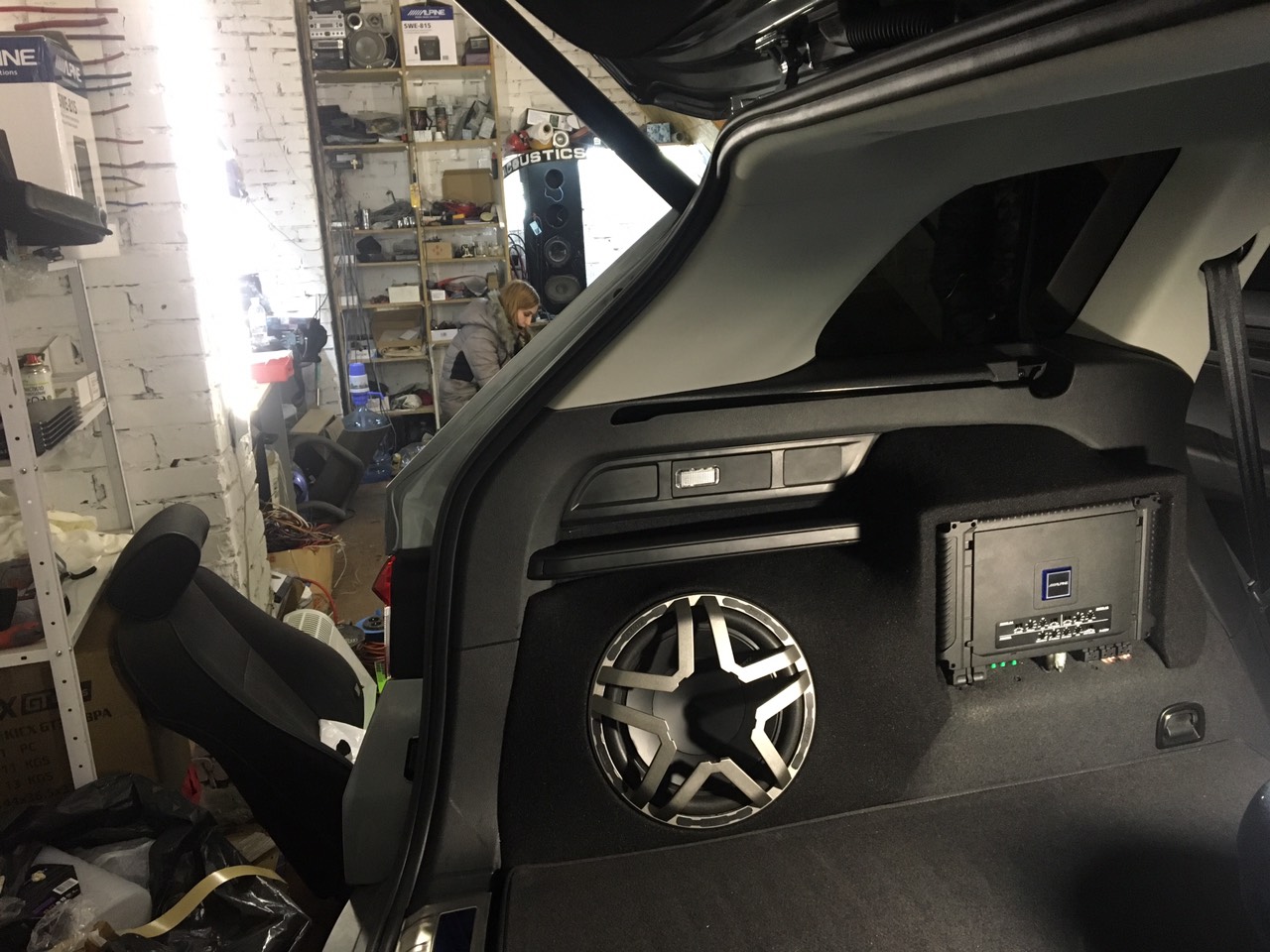 Короб сабвуфера відокремлений перегородкою від корпусу підсилювача, і має об'єм в 25 літрів, далі ми завели сабовий кабель в короб, поставили перемички на сабвуфері, так як він 2-х котушковий і буде працювати в 2Ом. І приступаємо до перетяжки нашого виробу для Skoda Kodiaq в чорний карпет, далі ми кріпимо наш мультикороб до металевих фільонок автомобіля, і правильно підключаємо підсилювач звуку в Skoda Kodiaq, на фініші презентуємо вам такий результат, над яким ми продуктивно працювали.