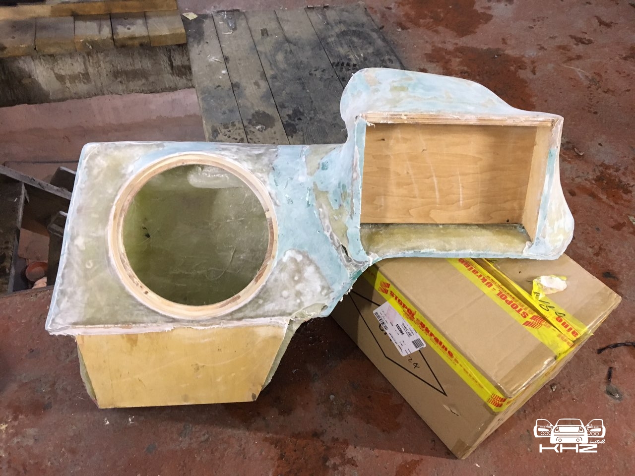 Тим часом ми робили анатомічний короб зі смоли і скломату, так само вирізали посадкове кільце для сабвуфера Hertz Energy розміром 10 дюймів - це один з найулюбленіших наших сабвуферів, потужний і чутливий.