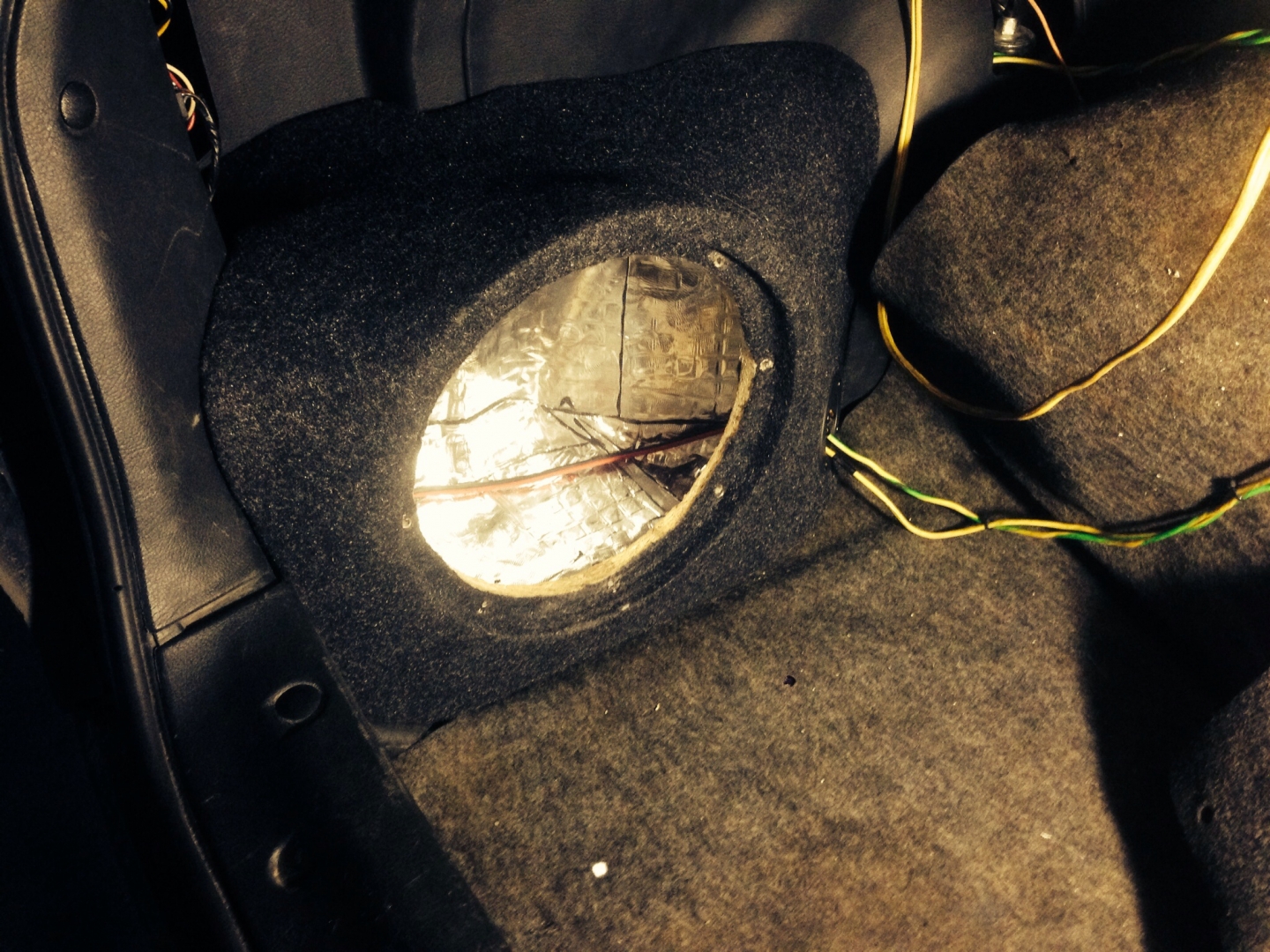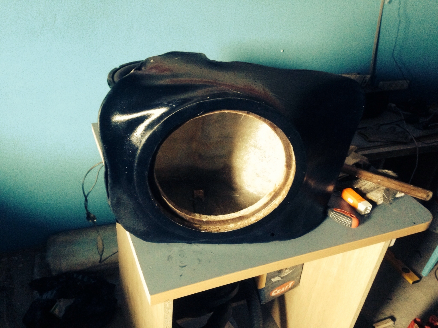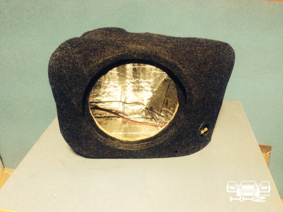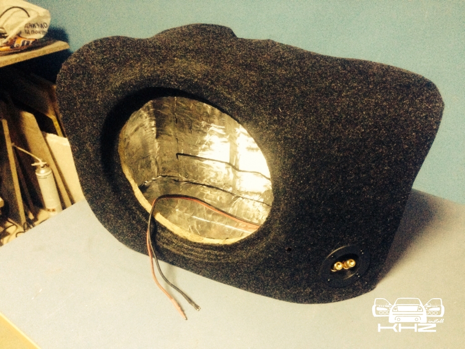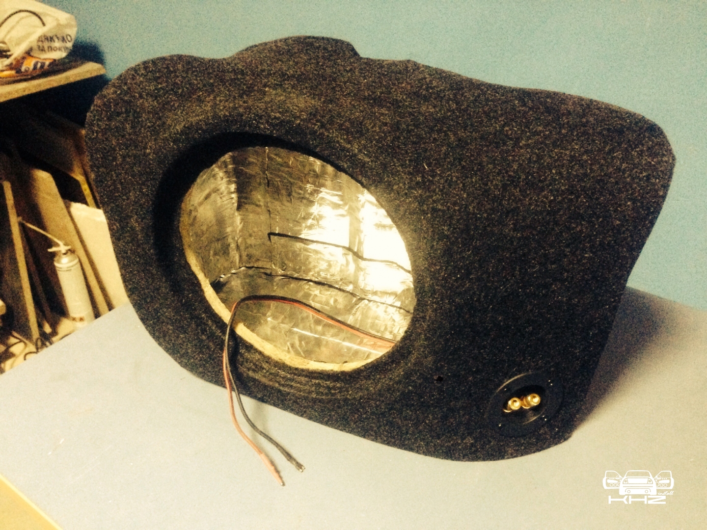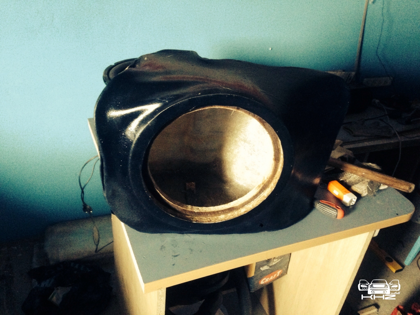 Перетяжку сабвуфера робили темно-сірим карпетом. Зсередини поклеїли весь корпус товстою віброізоляцією 3,5 мм.