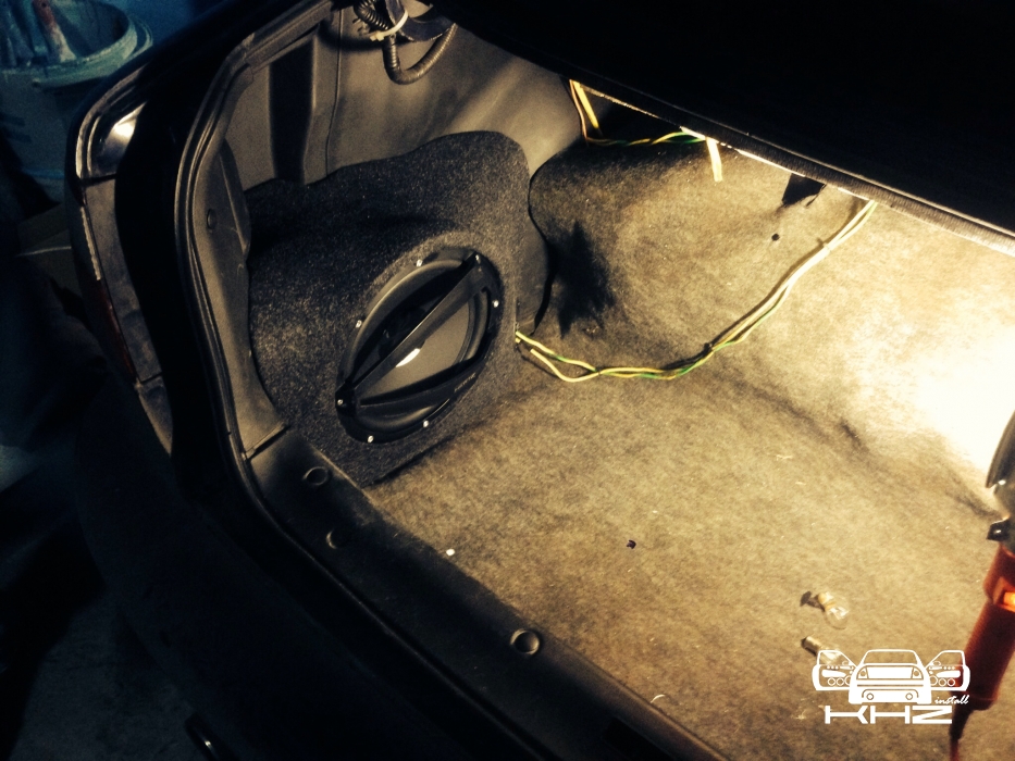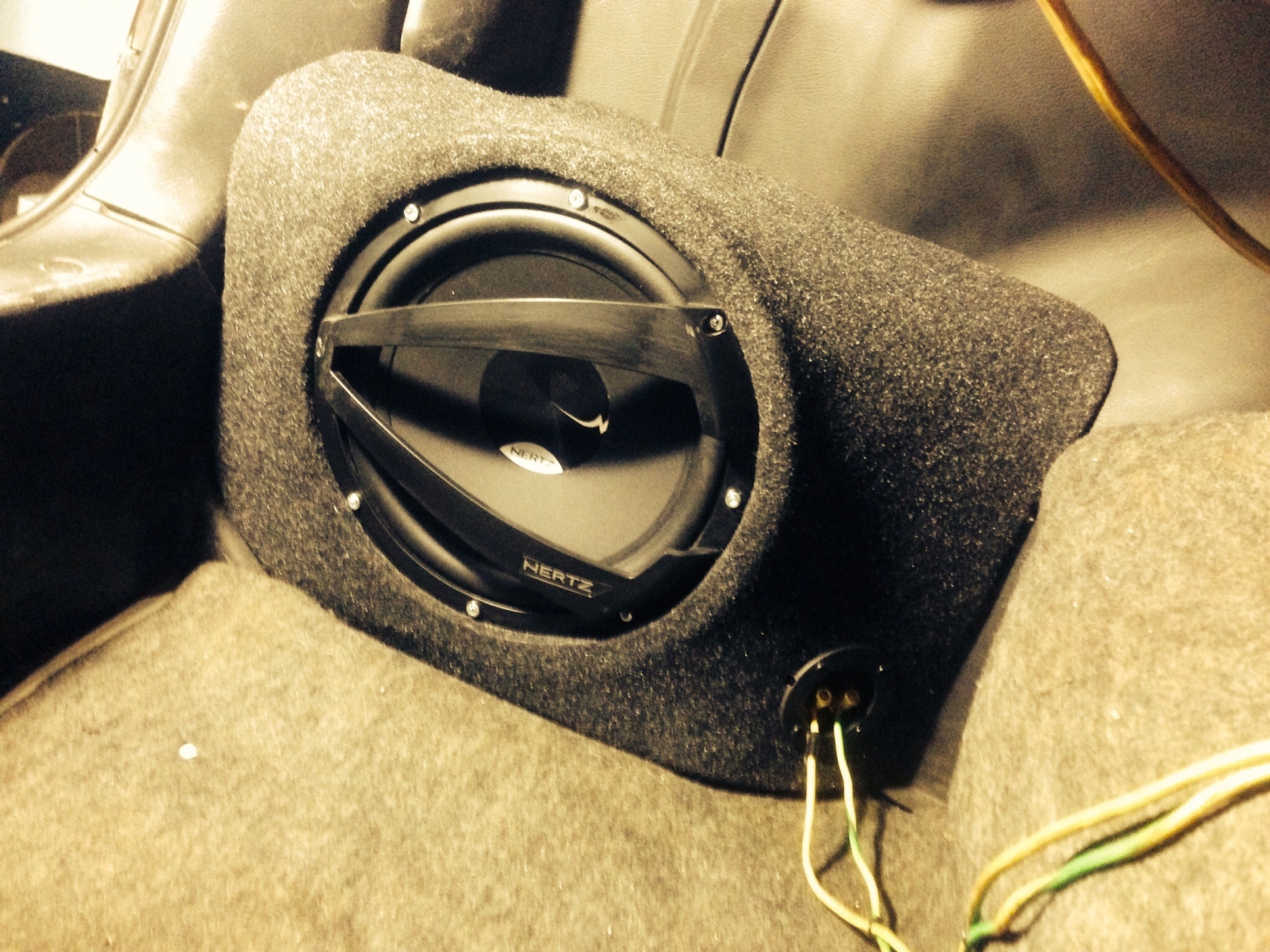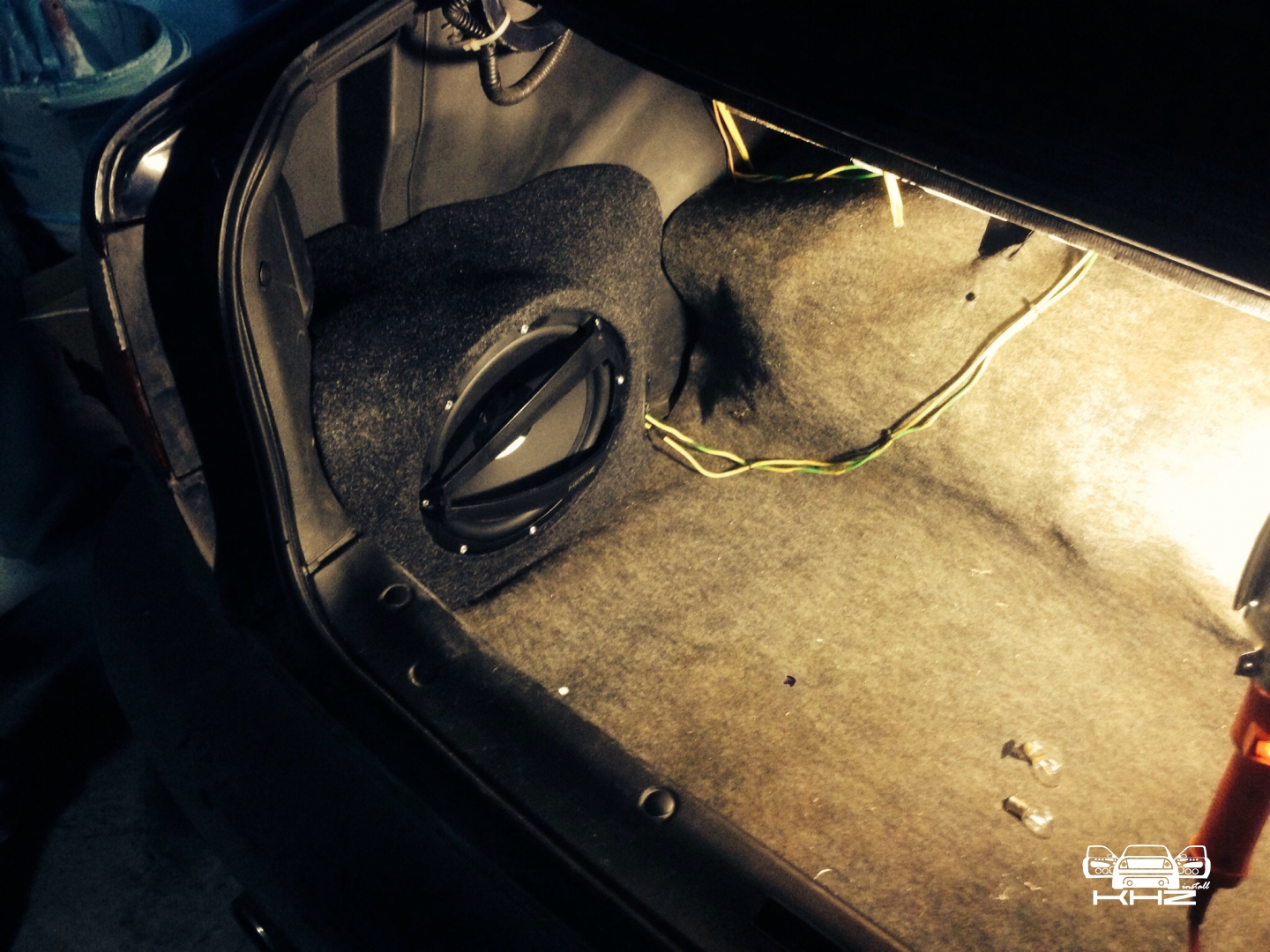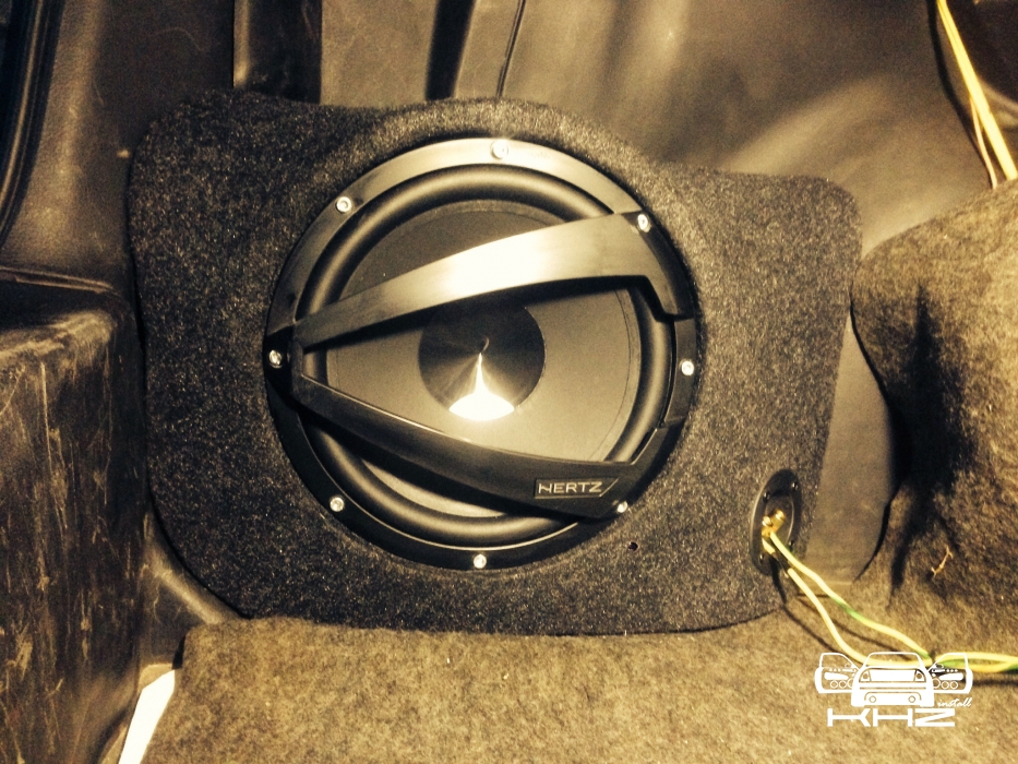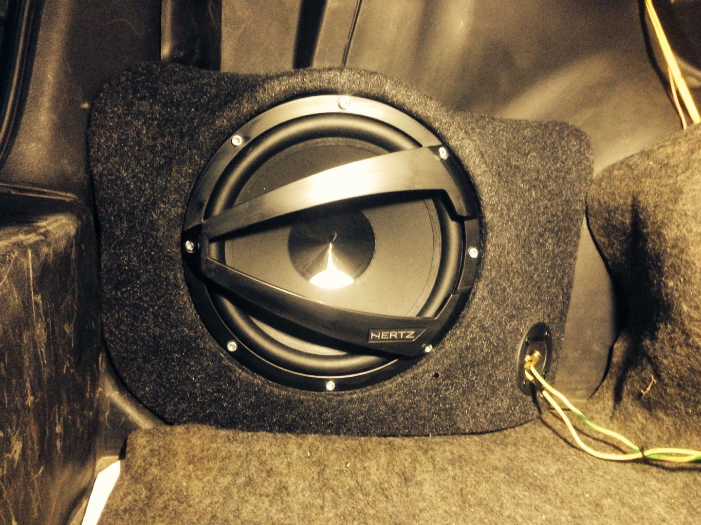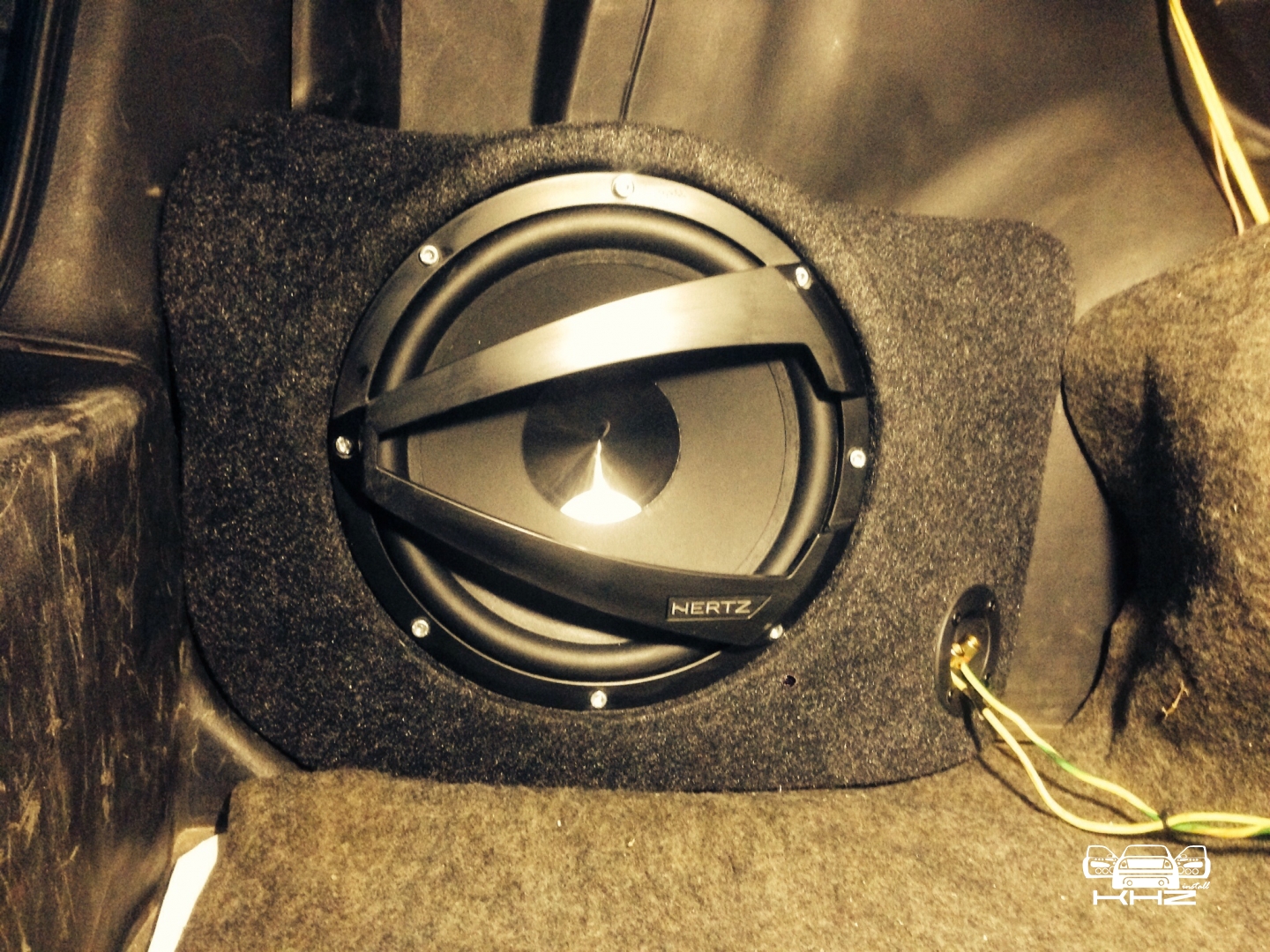 Оскільки місце в багажнику було дуже обмежене, сабік мав бути не більше 20 літрів. Для такого невеликого ящика відмінно підходить динамік Hertz DS 250, він вимагає всього лише 16л в ЗЯ і комплектується захисним грилем, що теж зручно.